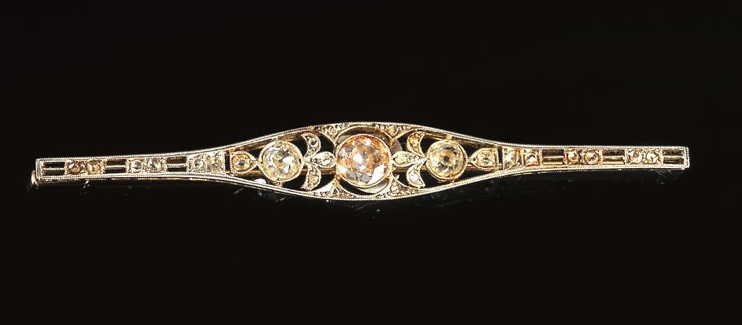 modellata come una barretta con brillanti taglio vecchio e rose di diamante posti in gradazione, entro astuccio d'epoca, g 8
