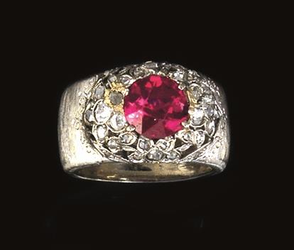 DUE ANELLI IN ORO BIANCO, RUBINO SINTETICO, ZAFFIRI SINTETICI E PASTE VITREE...