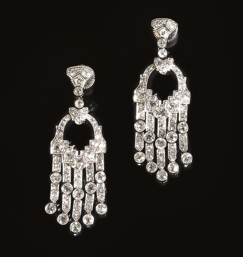 PAIO DI ORECCHINI, ANNI '20, PENDENTI IN ORO BIANCO E DIAMANTI
