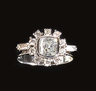 al centro un brillante di 1.51 ct a cuscino fancy light green entro cornice in brillanti e baguette, corredato di certificato GIA n. 1179167520, datato 28/04/2014