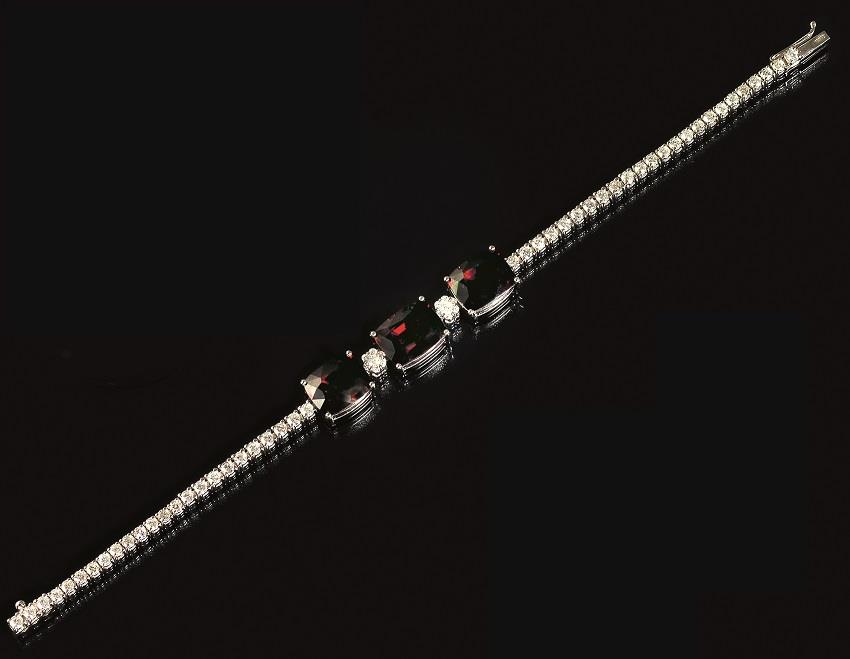 realizzato ad una fila di brillanti intercalati da tre spinelli rettangolari a cuscino, corredato di certificato Stalwart n. 124339, datato 29/05/2013, punzone 750, g 14
