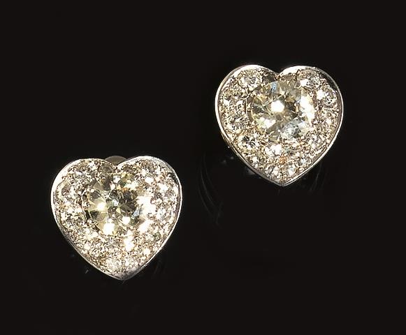 ciascuno realizzato a forma di cuore con pave di brillanti, al centro un brillante taglio vecchio di 1.80 ct circa, g 10