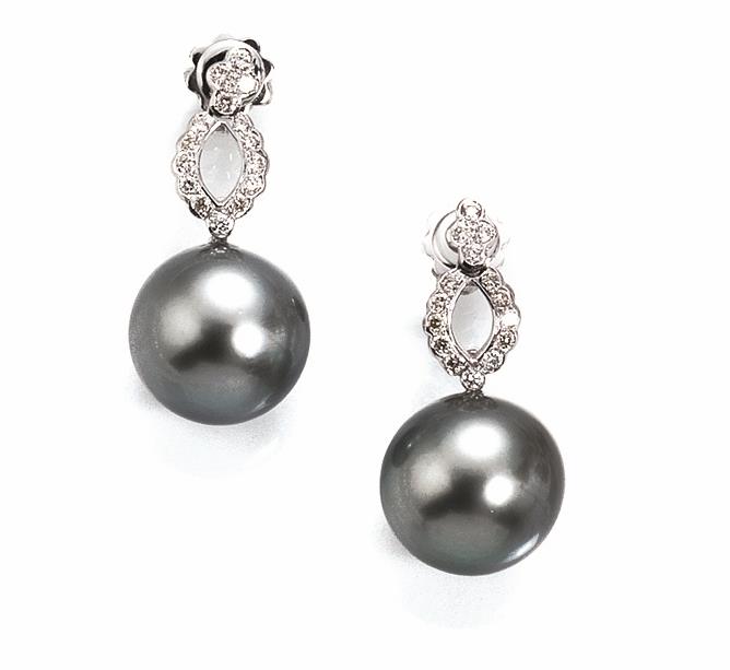 PAIO DI ORECCHINI PENDENTI IN ORO BIANCO, PERLE TAHITI E DIAMANTI