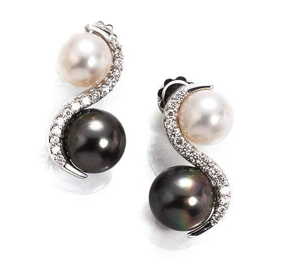 ciascuno realizzato a "S" decorata in brillanti con una perla bianca diam. mm 10 e una perla grigia diam. mm 11.5, punzone 750, g 13