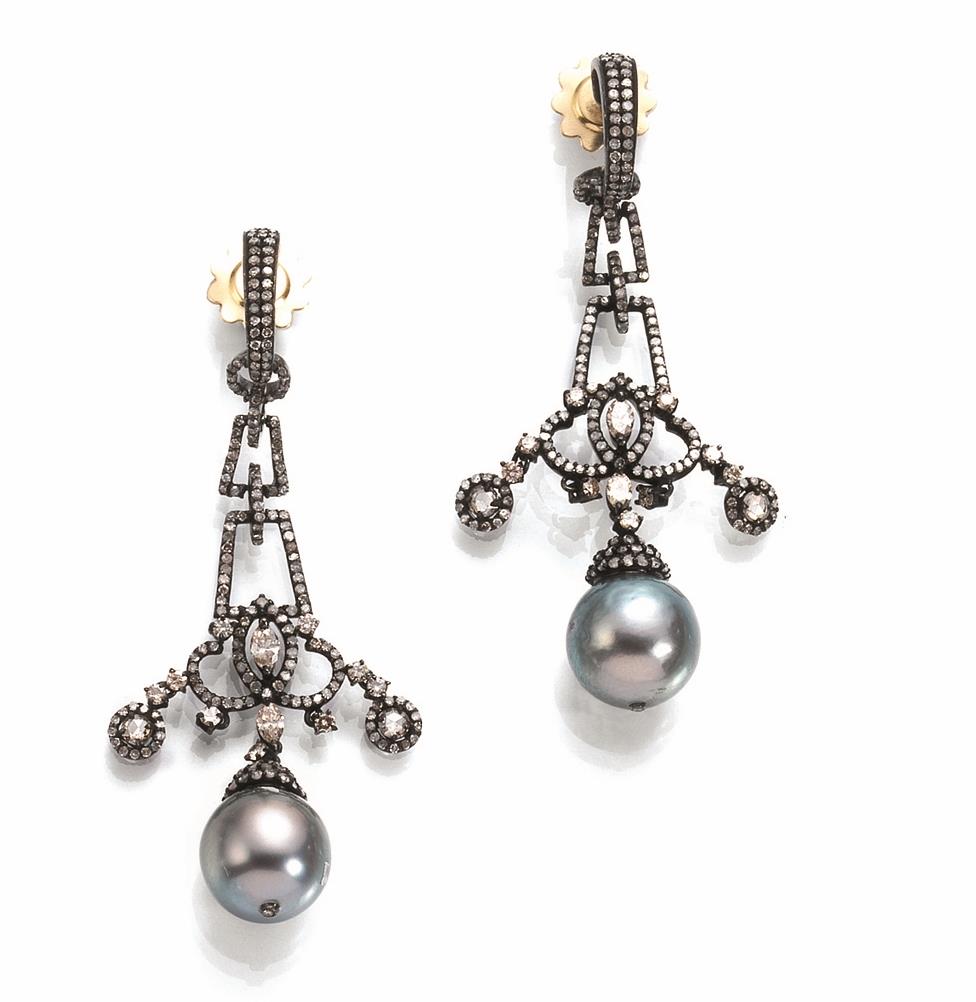 PAIO DI ORECCHINI PENDENTI IN ORO GIALLO, ORO BRUNITO, PERLA TAHITI E DIAMANTI