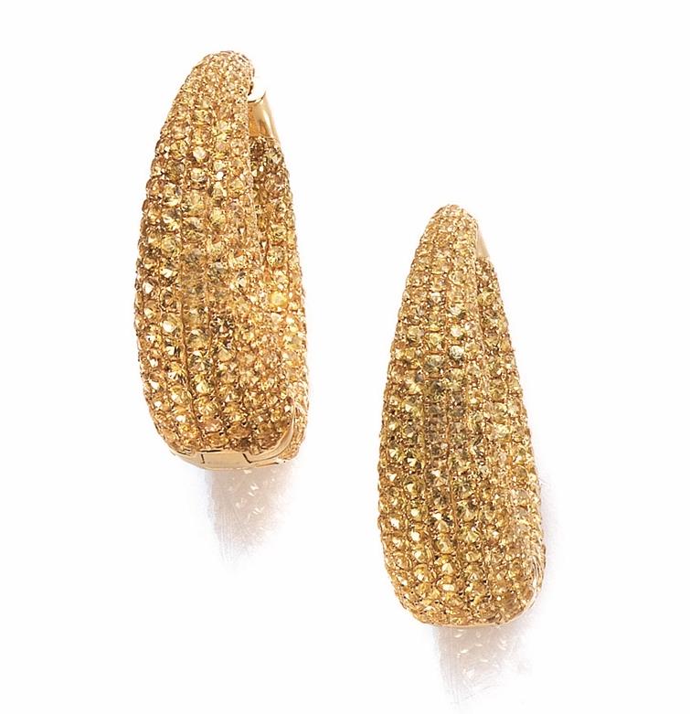 ciascuno realizzato a cerchio bombato quasi interamente decorato da zaffiri gialli, punzone 750, g 26
