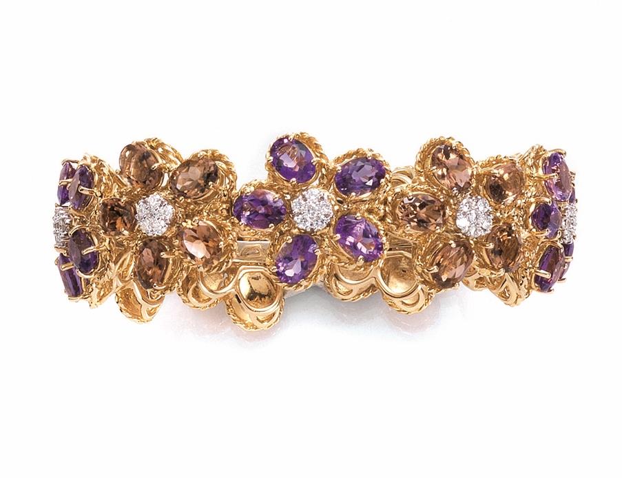 realizzato a cerchio semirigido decorato da corolle in brillanti con petali in ametiste e tormaline rosa, punzone 750, g 59