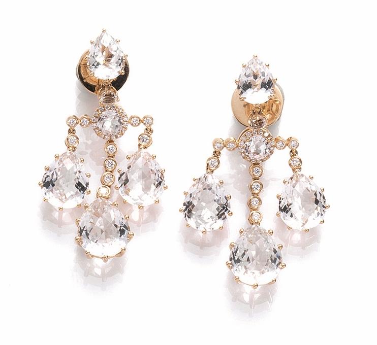 ciascuno realizzato a girandole con gocce in topazi incolori sfaccettati sospese a linee di brillanti, punzone 750, g 18