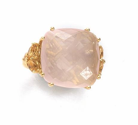 al centro un quarzo rosa sfaccettato con profilo quadrato affiancato da fiori in citrini, punzone 750, g 11