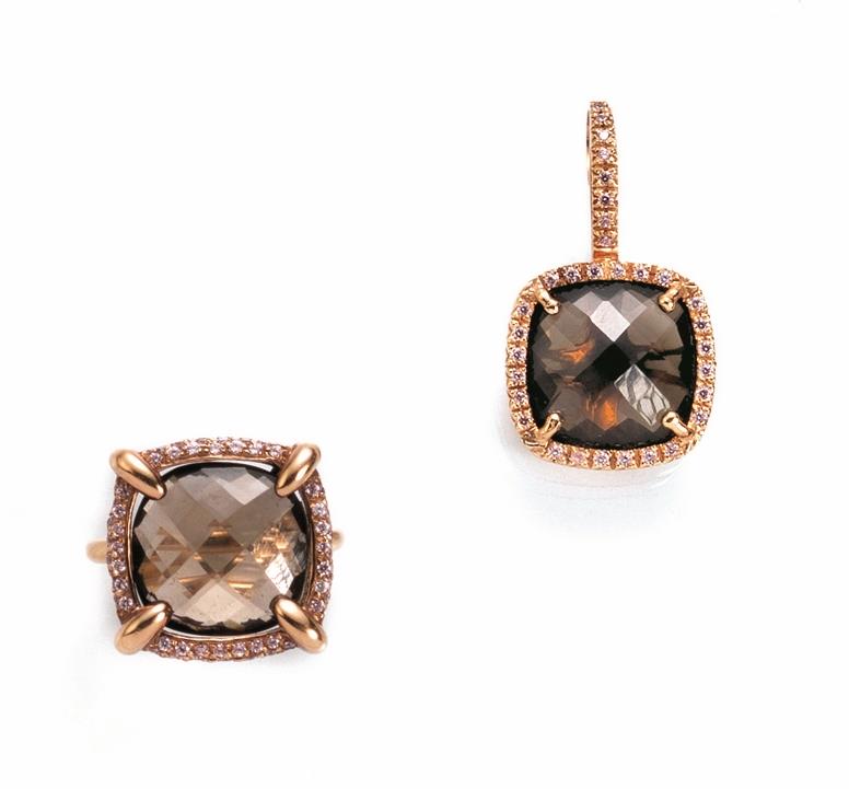 il pendente realizzato con quarzo affumicato quadrato a cuscino interamente sfaccettato entro cornice in zirconi rosa; l'anello en suite con il pendente, punzone 750, g 20 complessivi