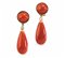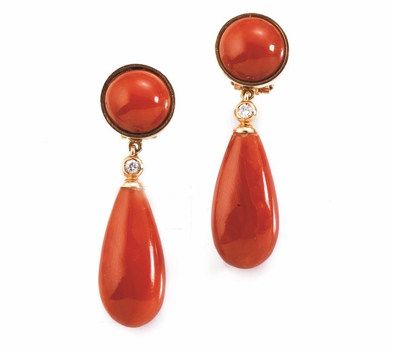 ciascuno realizzato da un cabochon in corallo rosso con profilo circolare a cui è sospesa una goccia in corallo sormontata da un brillante, g 20