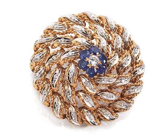 SPILLA IN ORO GIALLO, ORO BIANCO, ZAFFIRI E DIAMANTIdi forma circolare con...