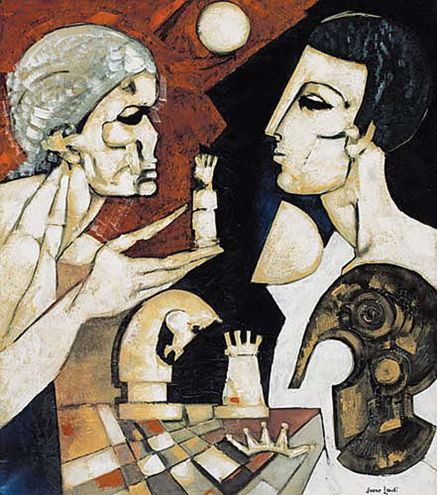 BRUNO LANDI Roma 23/03/1941 Omaggio a Ingmar Bergman da "il settimo sigillo" olio su tela cm. 80x70, firma in basso a destra, titolo e firma al retro, dichiarazione d'autenticità dell'artista e archivio Meeting Art (VC) su foto, pubblicato sul Catalogo Generale delle Opera di Bruno Landi primo volume, testi di Paolo Levi, Editoriale Giorgio Mondadori, pagina 33 con tavola a colori.