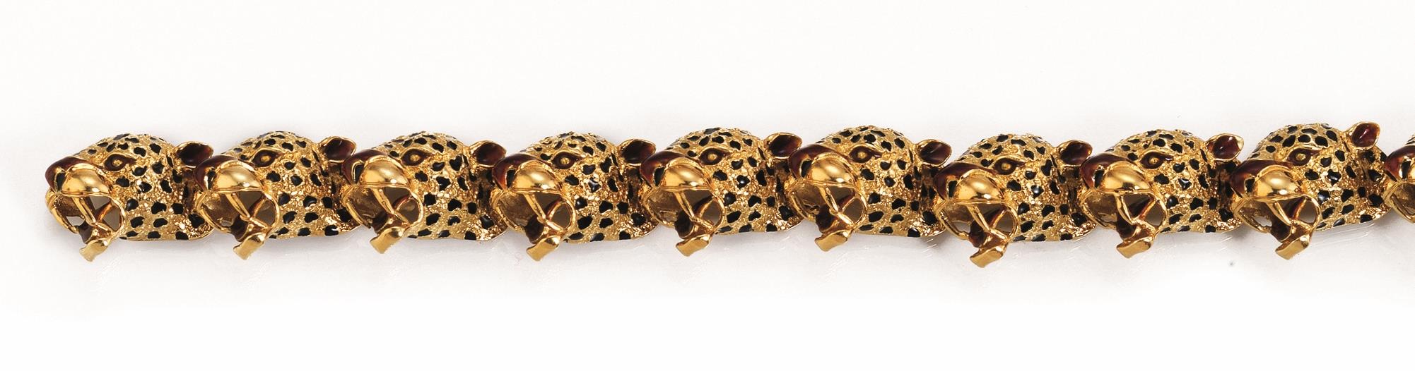realizzato ad una fila di dieci teste di leopardo decorate in smalti neri e rossi, g 80