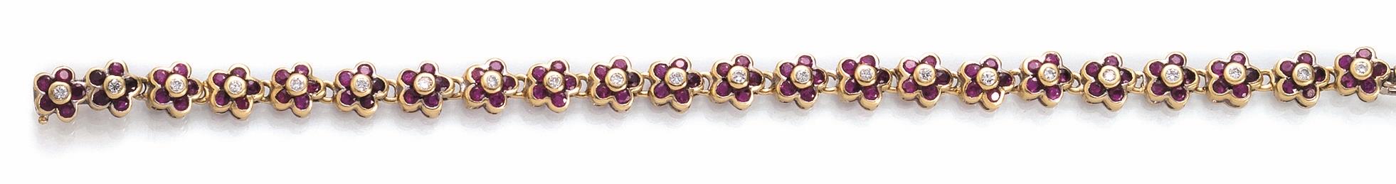 realizzato ad una fila di ventidue corolle con petali in rubini rotondi montati entro castoni in oro giallo, al centro di ogni fiore un brillante, g 20