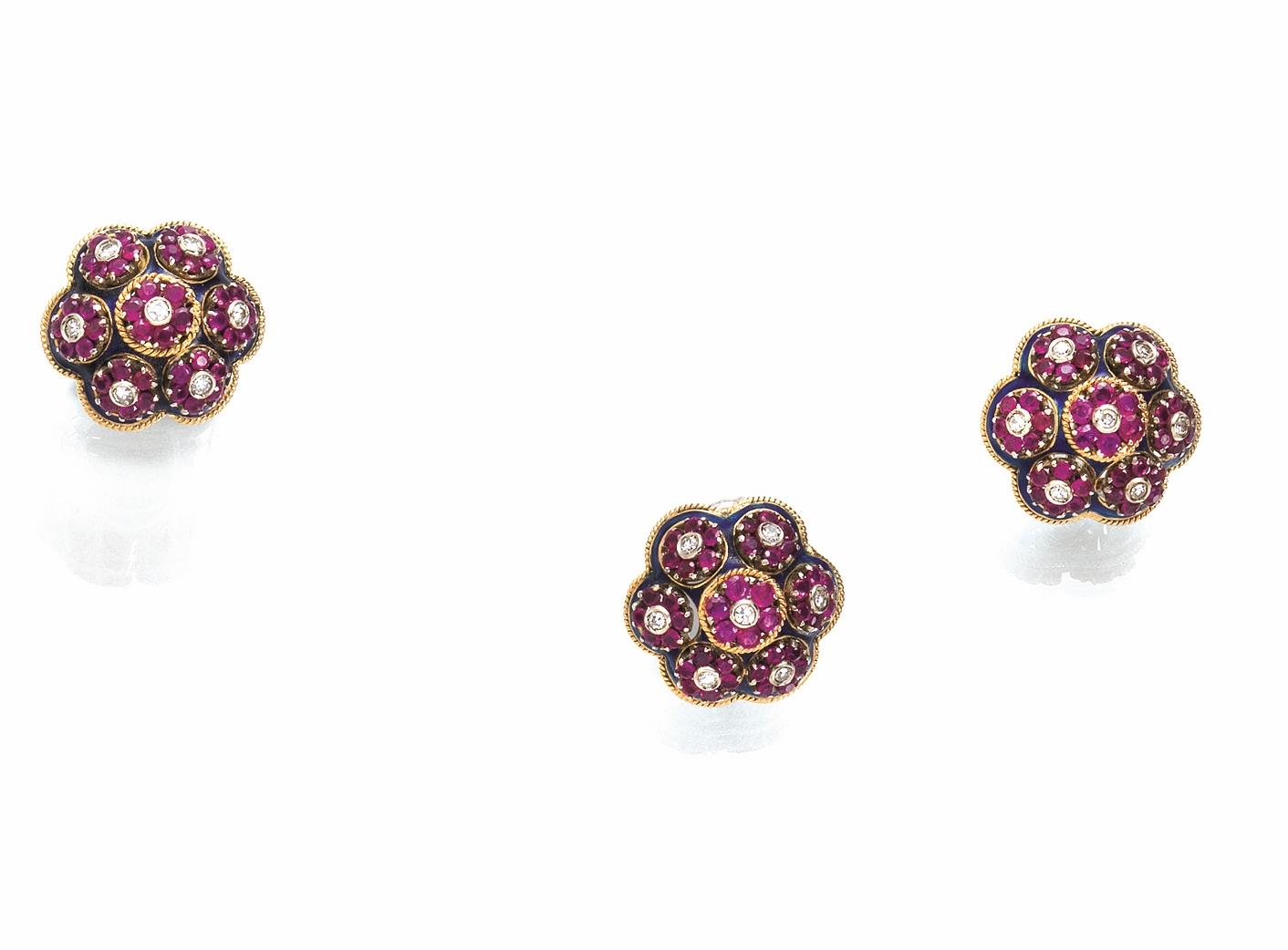 DEMI PARURE IN ORO GIALLO, ORO BIANCO, SMALTI, RUBINI E DIAMANTI COMPOSTA DA PAIO DI ORECCHINI E ANELLO