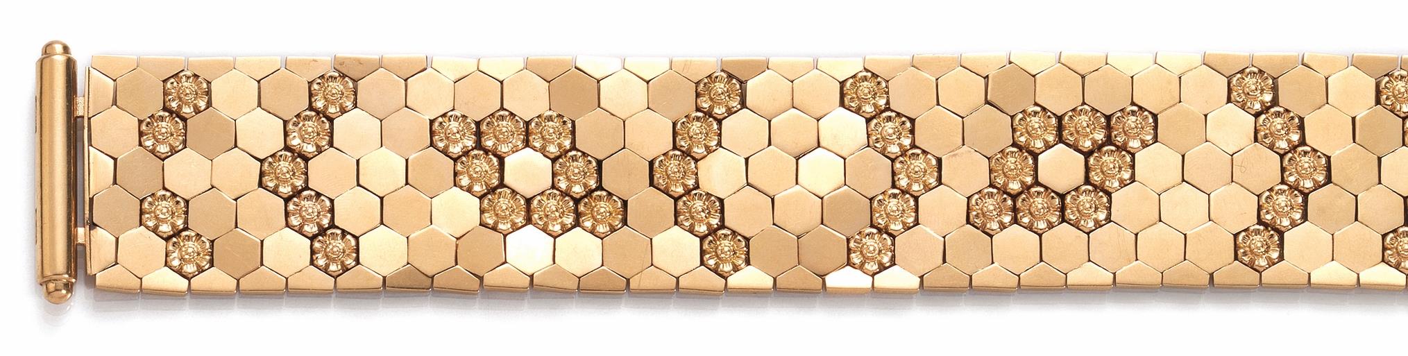 lavorato a nastro formato da elementi disposti a nido d'ape in parte cesellati a corolle, g 57