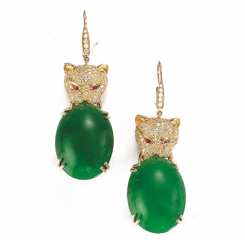 ciascuno realizzato con cabochon ovale in giada verde sormontato da testa di pantere in oro giallo, brillanti e rubini, punzone 750, g 28