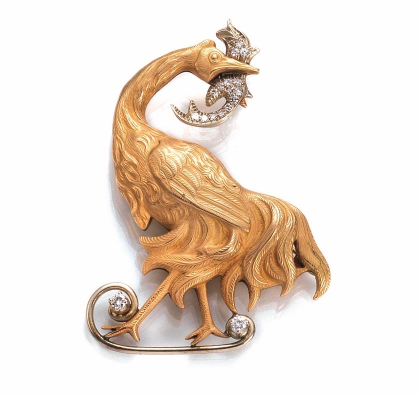modellata come un volatile in oro satinato in parte decorato da brillanti moderni e taglio huit huit, g 27