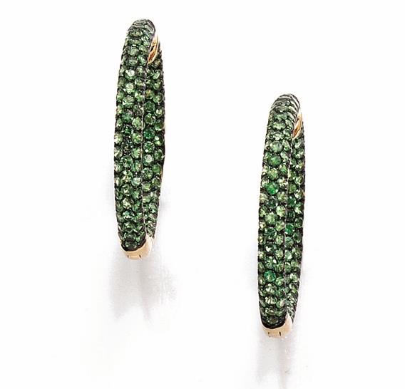 Lot 362 | PAIO DI ORECCHINI IN ORO GIALLO, ORO BRUNITO E GRANATI ciascuno realizzato a...