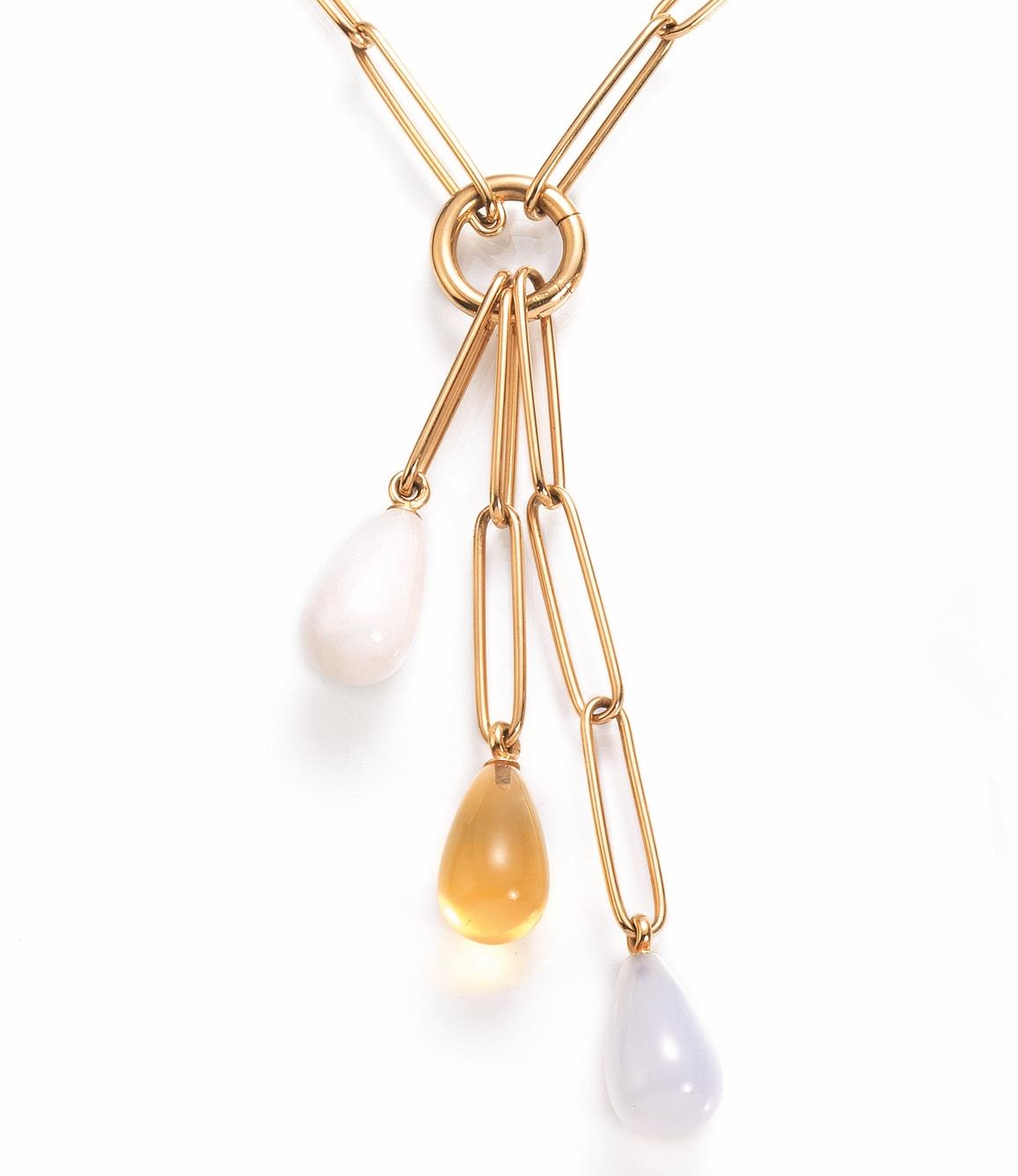 realizzata ad una fila di maglie ovali legate ad un anello a cui sono sospese tre linee di maglie con pendenti finali a goccia in quarzo citrino, calcedonio latteo e giadeite bianca, punzone 750, g 32