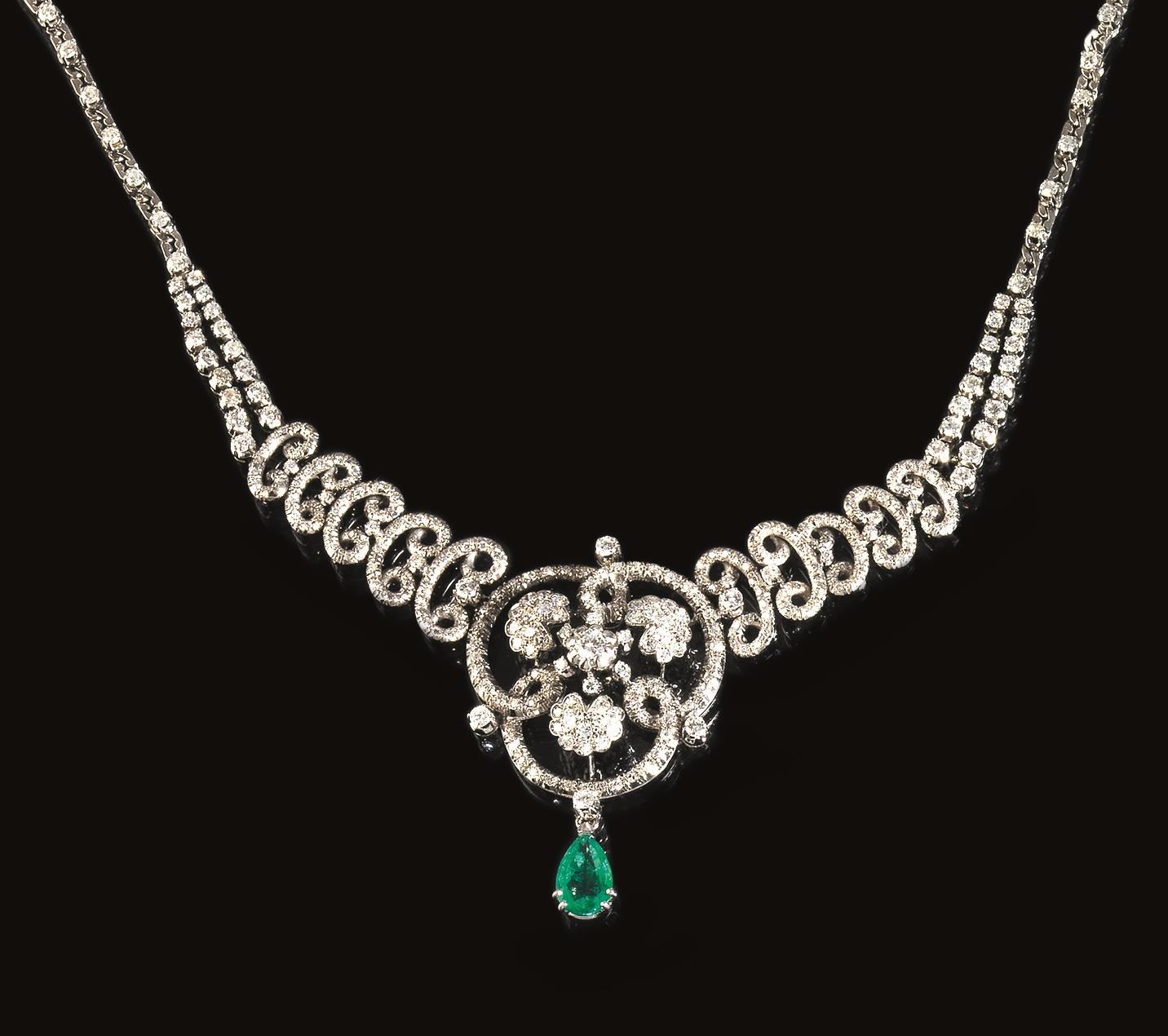 COLLANA IN ORO BIANCO, SMERALDO E DIAMANTIal centro un motivo a volute e...