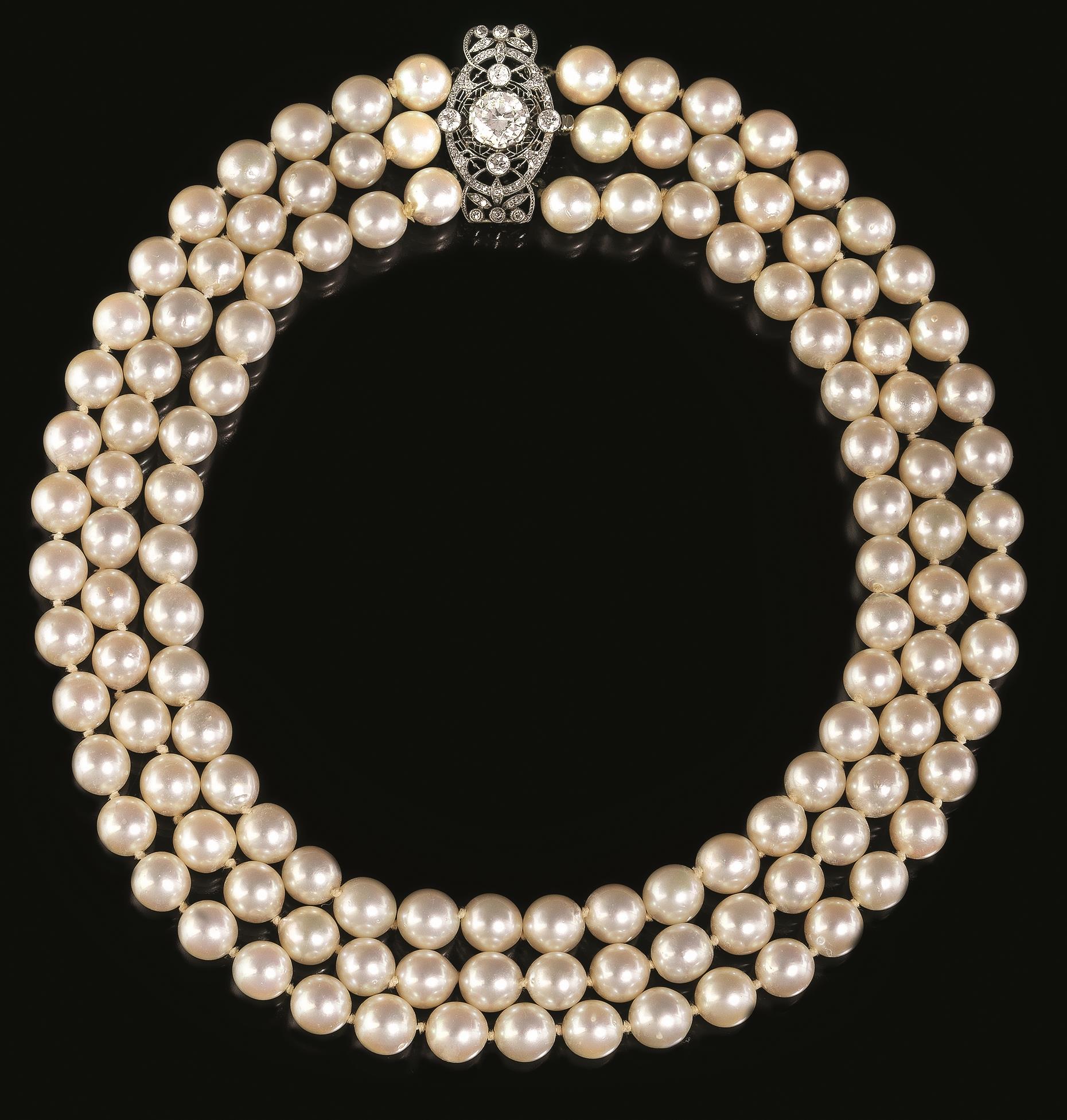 realizzata a tre fili di perle coltivate diam. mm 9-9.5 mm, fermatura impreziosita da brillanti taglio vecchio e diamante centrale di taglio moderno di ct 2.10 circa, g 148