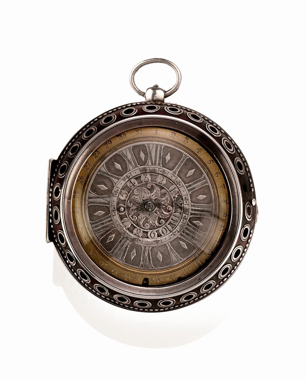 OROLOGIO DA TASCA CON DATARIO E SVEGLIA, CLAUDE VIET LONDON, 1690 CIRCA, IN ARGENTO E LACCA