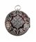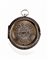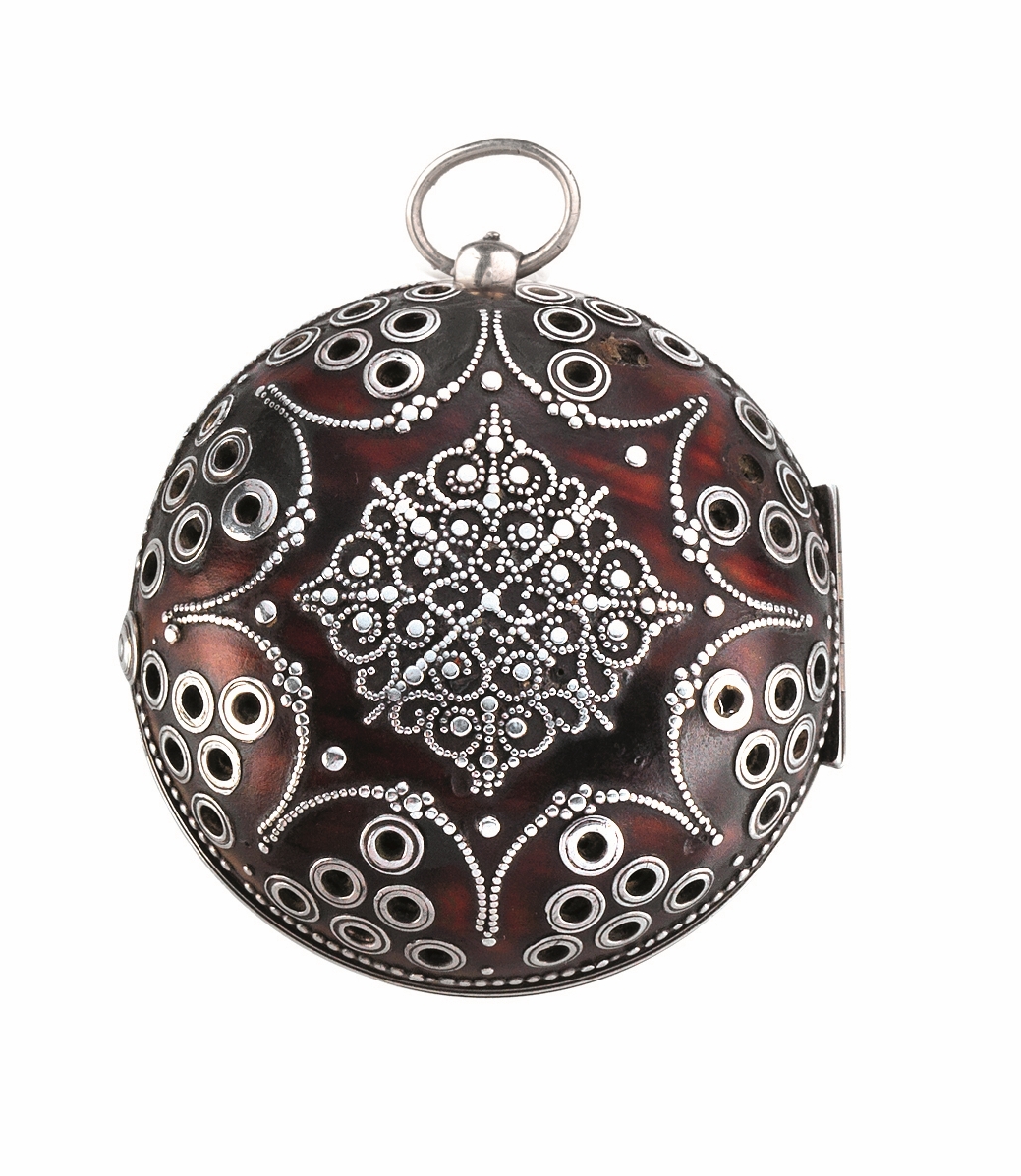 Cassa in argento traforato a volute vegetali entro cui sono raffigurate composizioni floreali e volatili, due aperture sul retro per la carica delle ore e della sveglia, controcassa rivestita in lacca con decorazioni ad occhielli e motivi geometrici in argento. Quadrante in argento con anello delle ore in numeri romani intercalati da piccoli rombi, piccolo disco concentrico per la sveglia con numeri arabi e punta indicatrice dell’ora, anello periferico in ottone con giorni del mese in numeri arabi. Movimento con scappamento a verga, carica e rimessa delle ore a chiavetta. Diam. mm 49