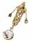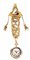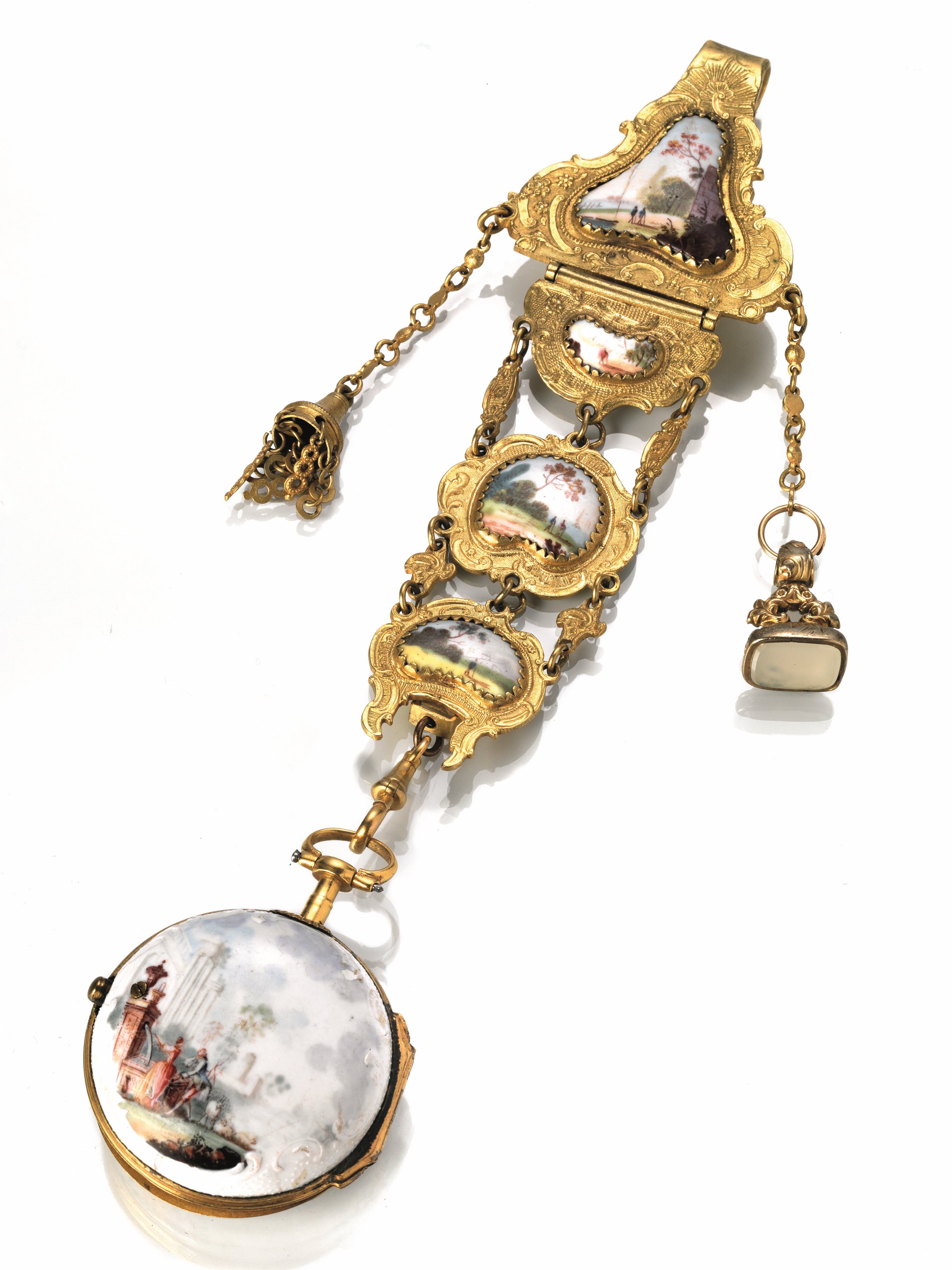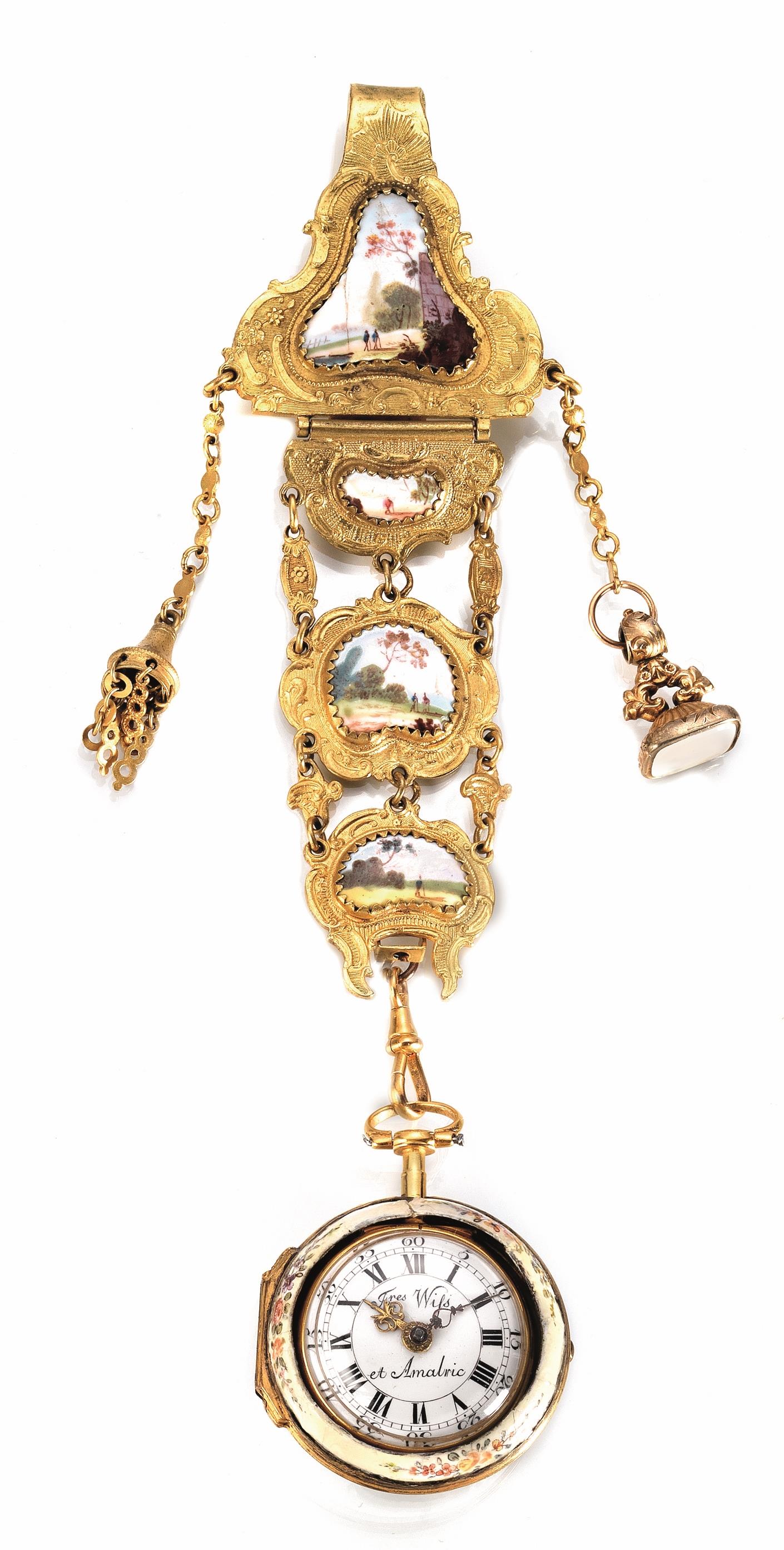 Cassa in oro liscio, copri cassa in porcellana con montatura in metallo dorato con paesaggio architettonico in policromia e decori floreali. Quadrante firmato in smalto bianco con ore in numeri romani e minuti in numeri arabi. Movimento firmato e numerato con scappamento a verga, carica e rimessa delle ore a chiavetta. Chatelaine in metallo dorato cesellato a rocaille e motivi floreali composta da un elemento sagomato centrato da una placchetta in porcellana decorata in policromia a paesaggio. Ad essa è sospesa una fila di tre elementi sagomati analogamente decorati e due pendenti laterali a nappa e sigillo. Diam. mm 44, lunghezza chatelaine cm 16