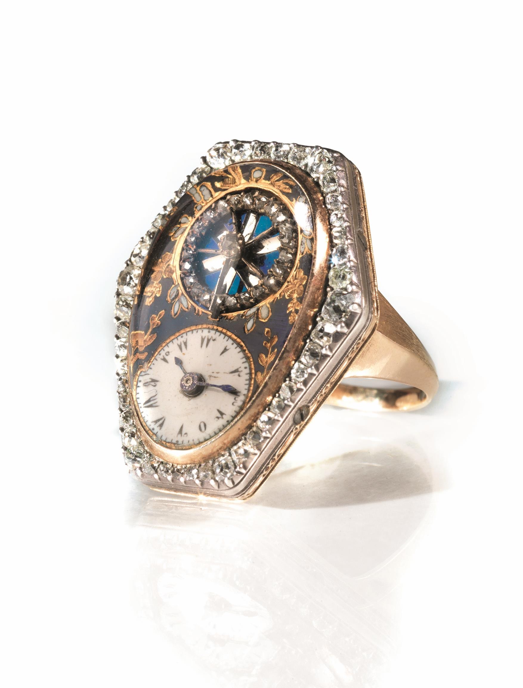 RARO ANELLO OROLOGIO PER IL MERCATO TURCO, 1800 CIRCA, IN ORO GIALLO SMALTO E DIAMANTI