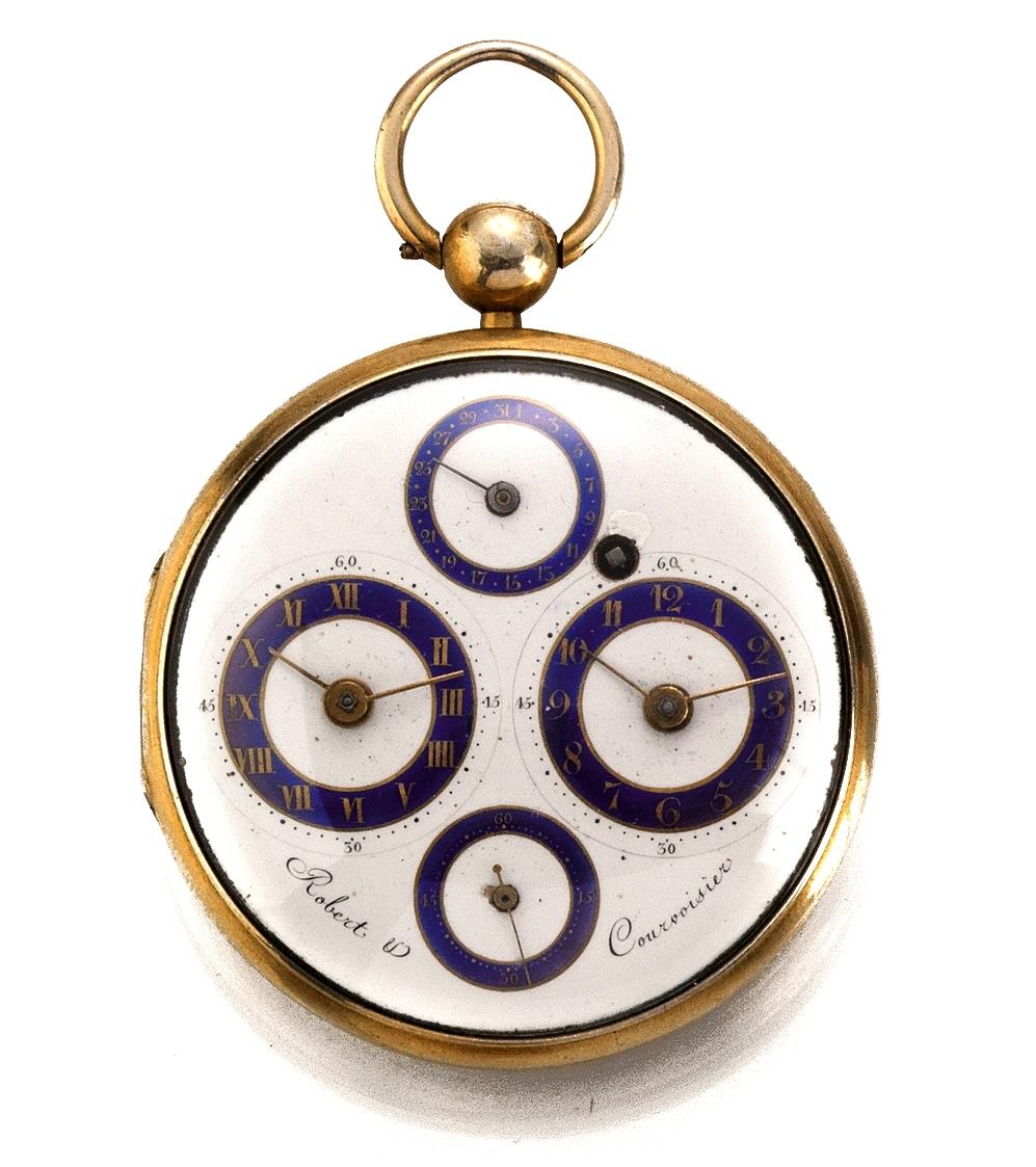 OROLOGIO DA TASCA A QUATTRO QUADRANTI DOPPIO FUSO ORARIO E DATARIO, ROBERT ET COIRVOISIER, N. 23474, 1820 CIRCA, IN METALLO DORATO
