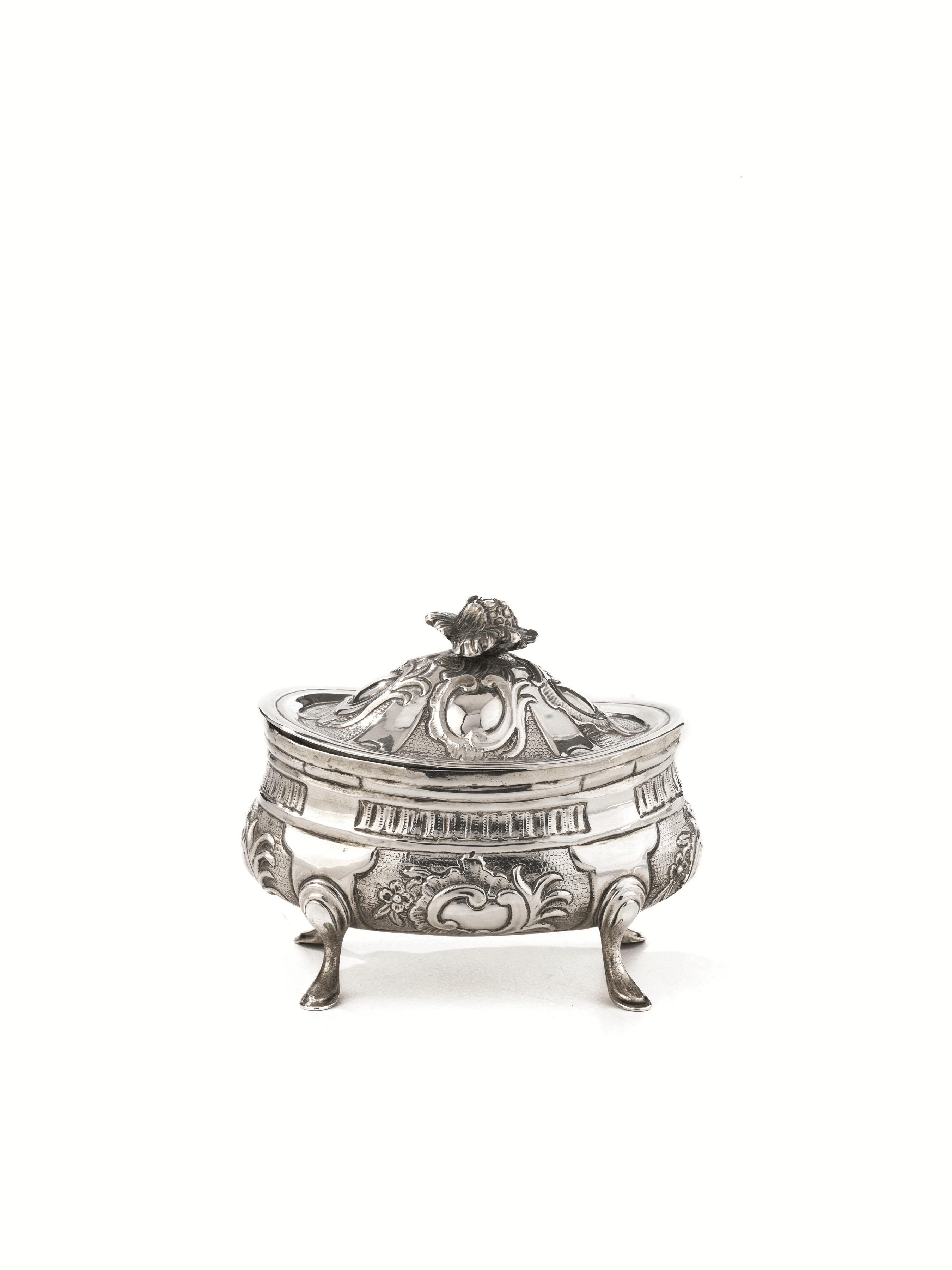 di forma ovale, corpo sbalzato a volute e fiori, quattro piedini a zoccolo stilizzato, finale del coperchio a bocciolo, cm 11x9, g 209
