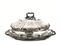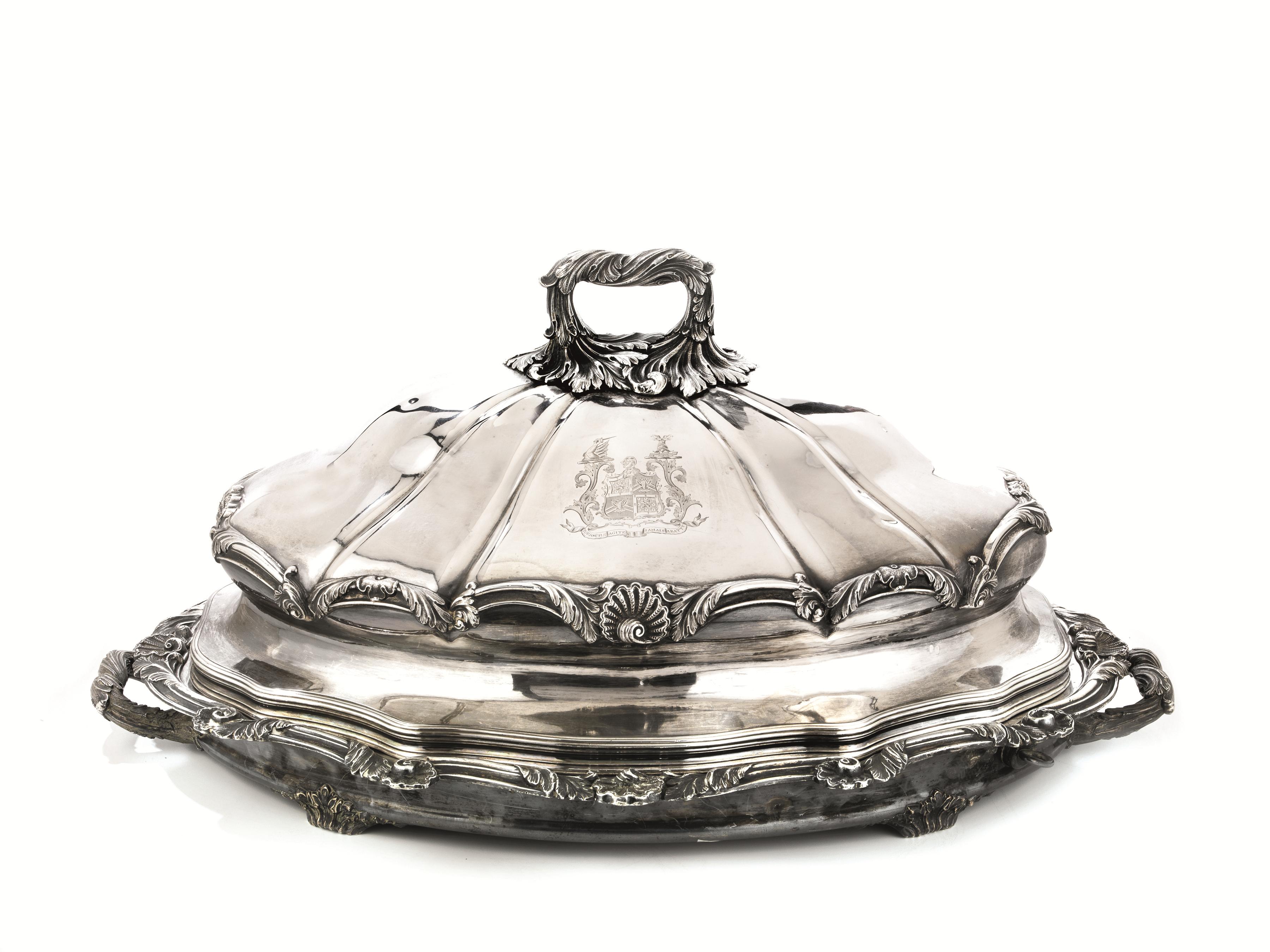 in sheffield plate di forma ovale con decoro a tralcio di volute fogliacee e stemma nobiliare inciso con cartiglio iscritto toutjours agite jamais abbate, presa del coperchio a foglie contrapposte, cm 66x49