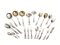 Composizione: 18 coltelli, 18 forchette, 18 cucchiai, 12 forchette da pesce, 12 coltelli da pesce, 24 coltelli da frutta, 12 forchette da frutta, 12 cucchiai da frutta, 10 cucchiaini da caffè, 12 cucchiaini da tè e 11 posate da portata
