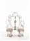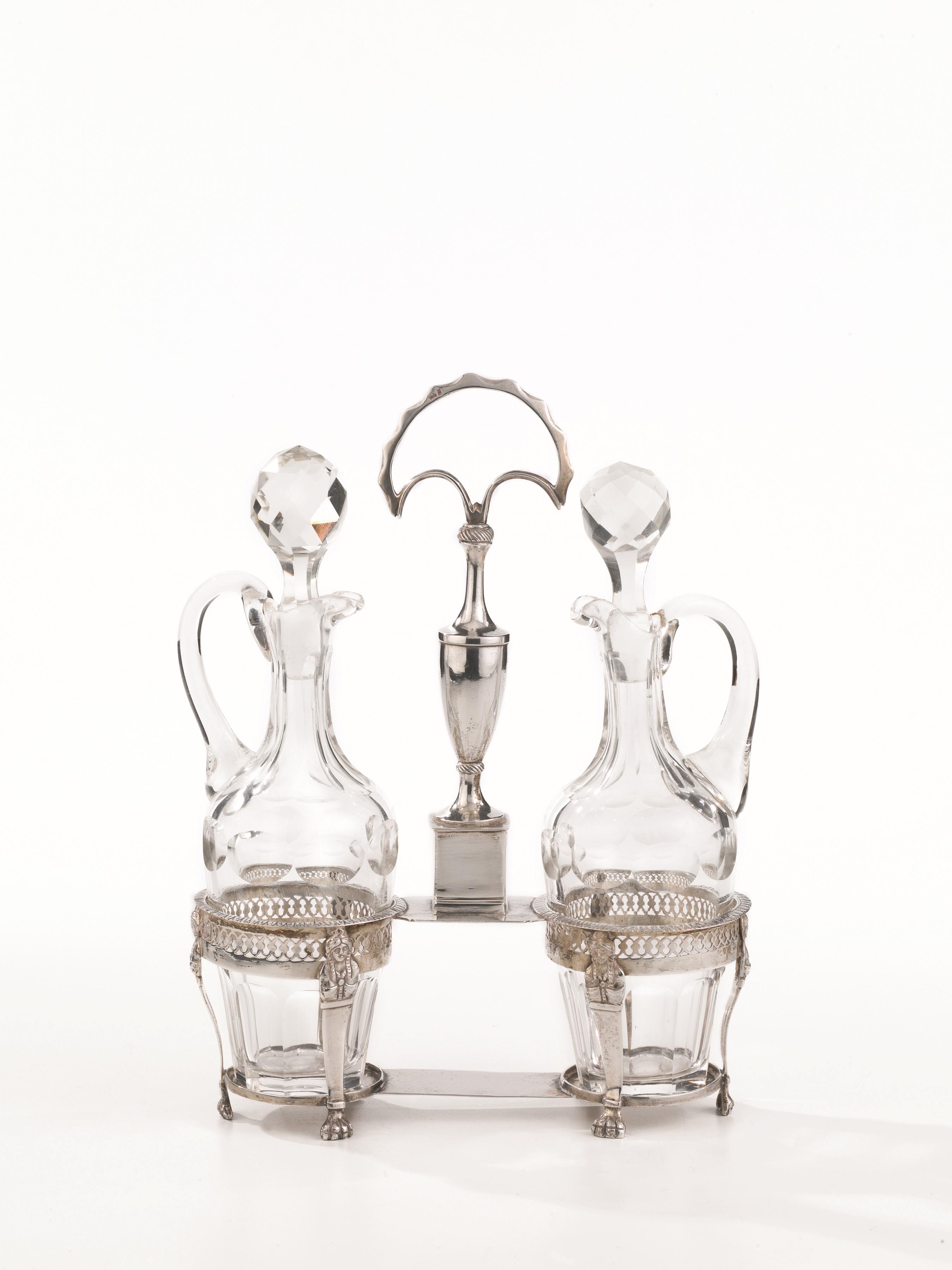 in argento, porta ampolle con bordo traforato e ciascuno poggiante su tre lesene terminanti a zampa ferina, fusto centrale con presa sagomata, completa di ampolle, alt. cm 26, g 325