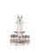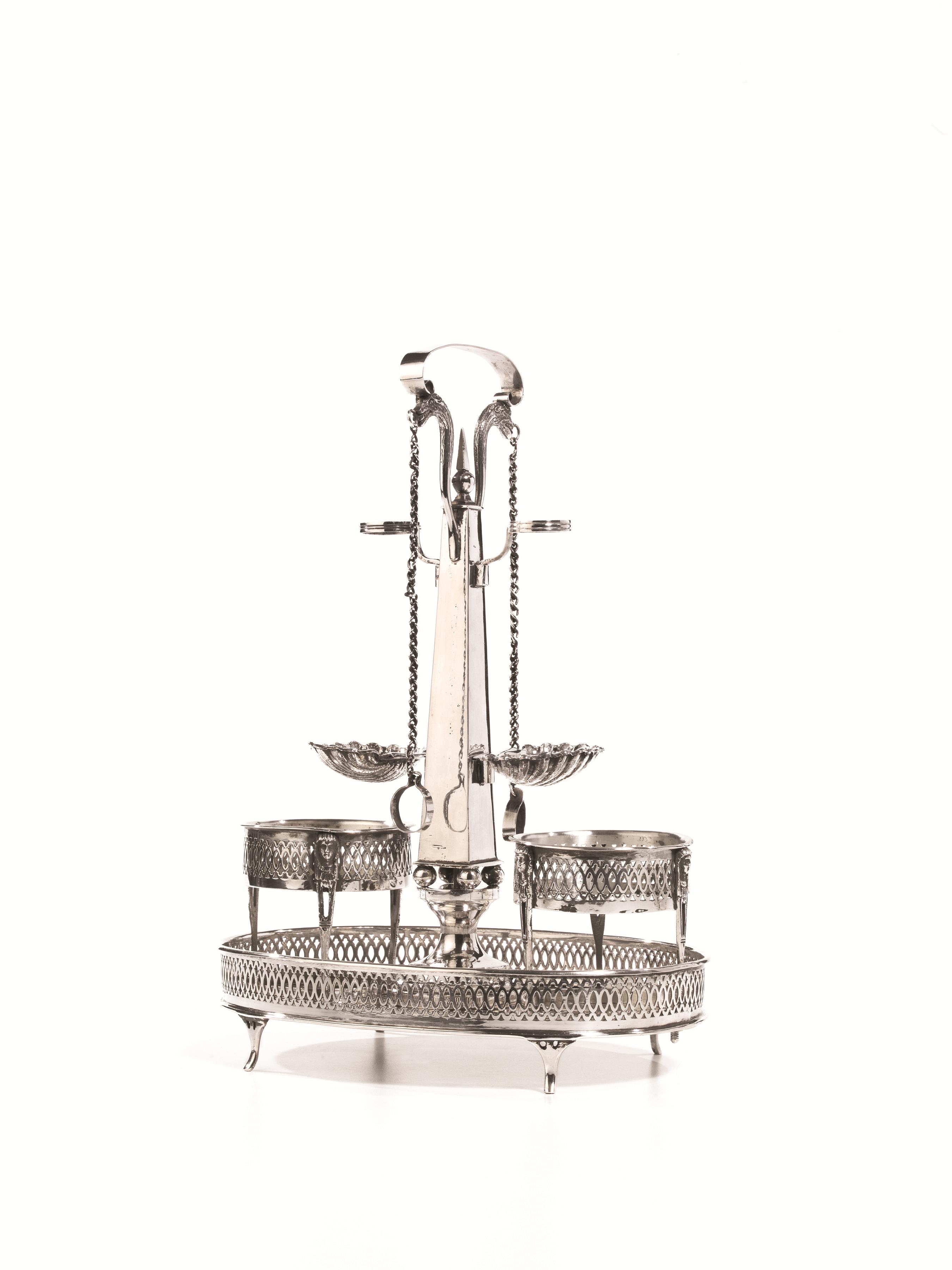base ovale con bordo traforato, fusto modellato come un obelisco terminante con due teste d animali fantasici, saliere realizzate a conchiglia, completa di ampolle, alt. cm 30, g 700
