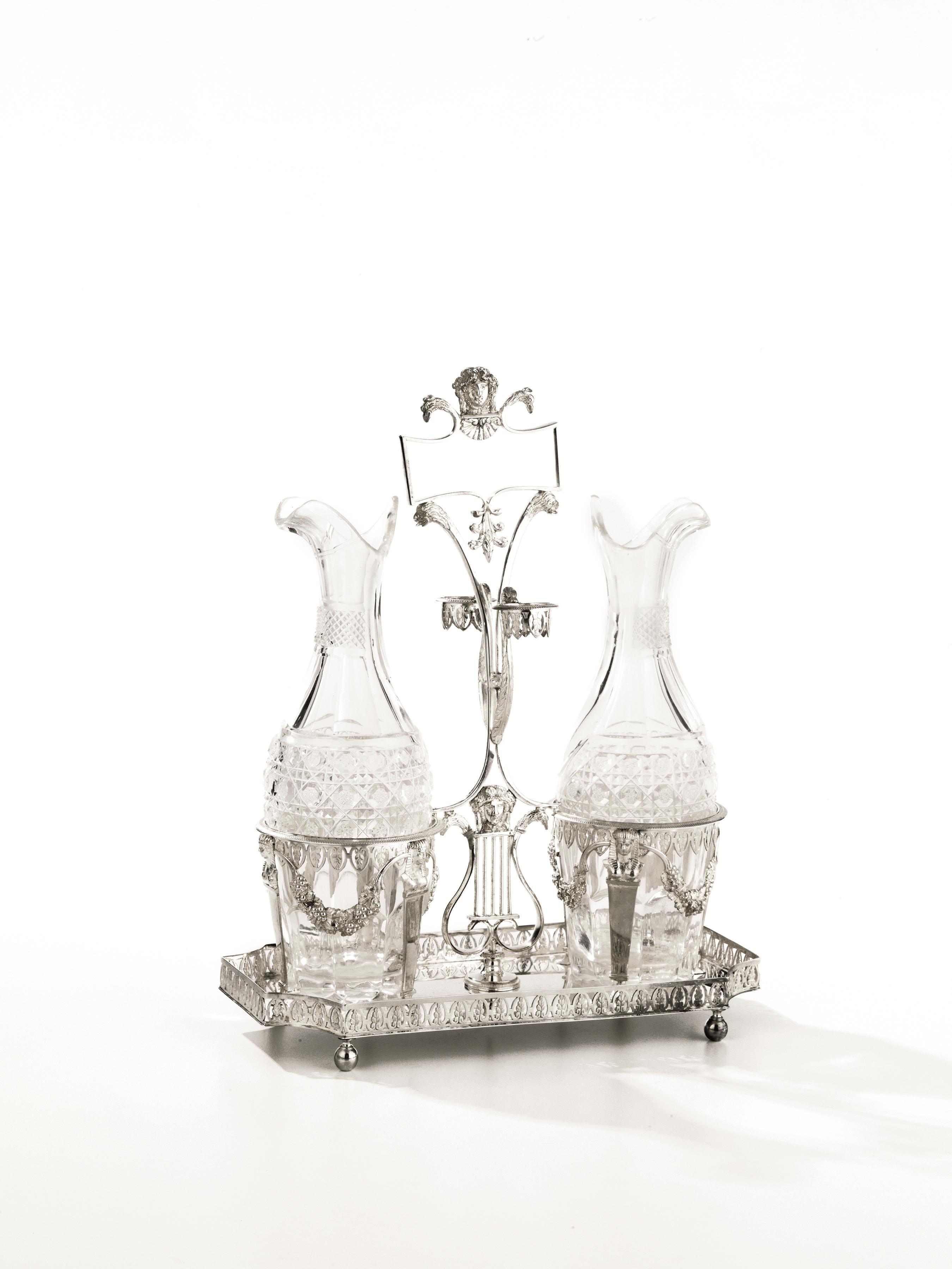 in argento, base rettangolare con bordo traforato poggiante su quattro piedini a sfera, fusto modellato come una lira con marscheroni, presa geometrica terminante con teste di aquile, completa di ampolle, alt. cm 29,5, g 690
