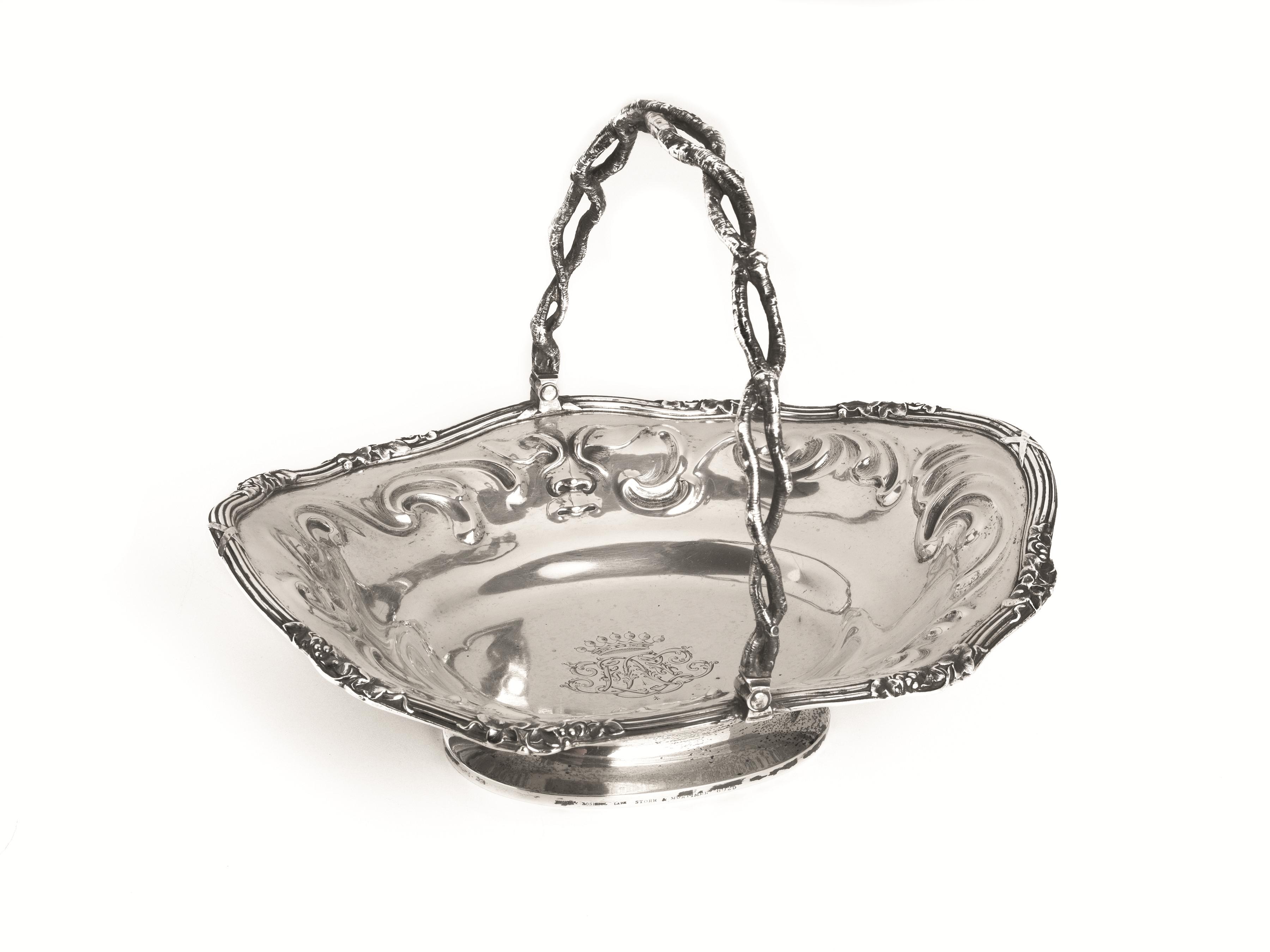 di forma ovale con bordo sagomato, al centro monogramma coronato, manico realizzato come due arbusti intrecciati, cm 34,5x28, g 1225