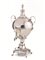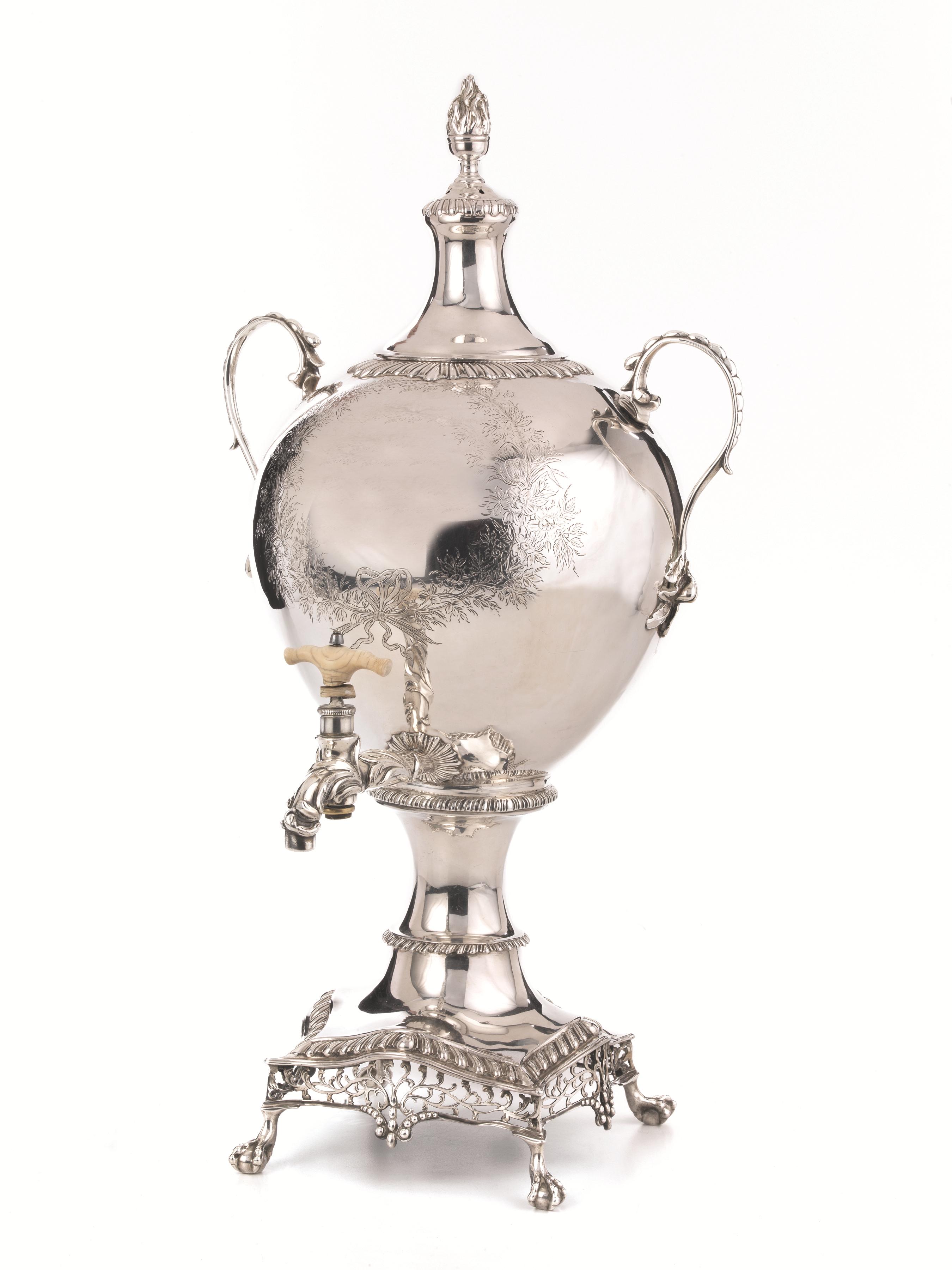 in argento, corpo sferico decorato da nastro di fiori con fiocco, base quadrata sagomata con bordo traforato poggiante su quattro piedini realizzati come artigli su sfere, due anse, finale del coperchio a fiamma, alt. cm 52, g 2355