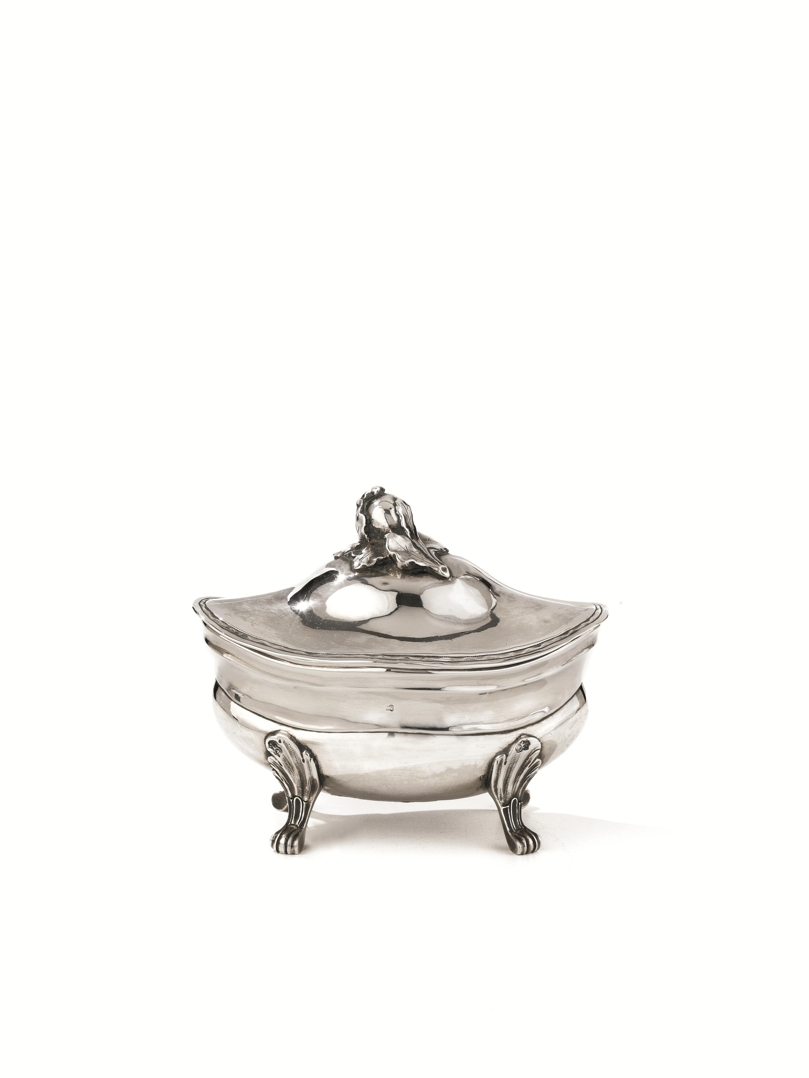 di forma ovale in argento, quattro piedini modellati come foglie, finale del coperchio a bocciolo, cm 11,5x8, g 240
