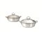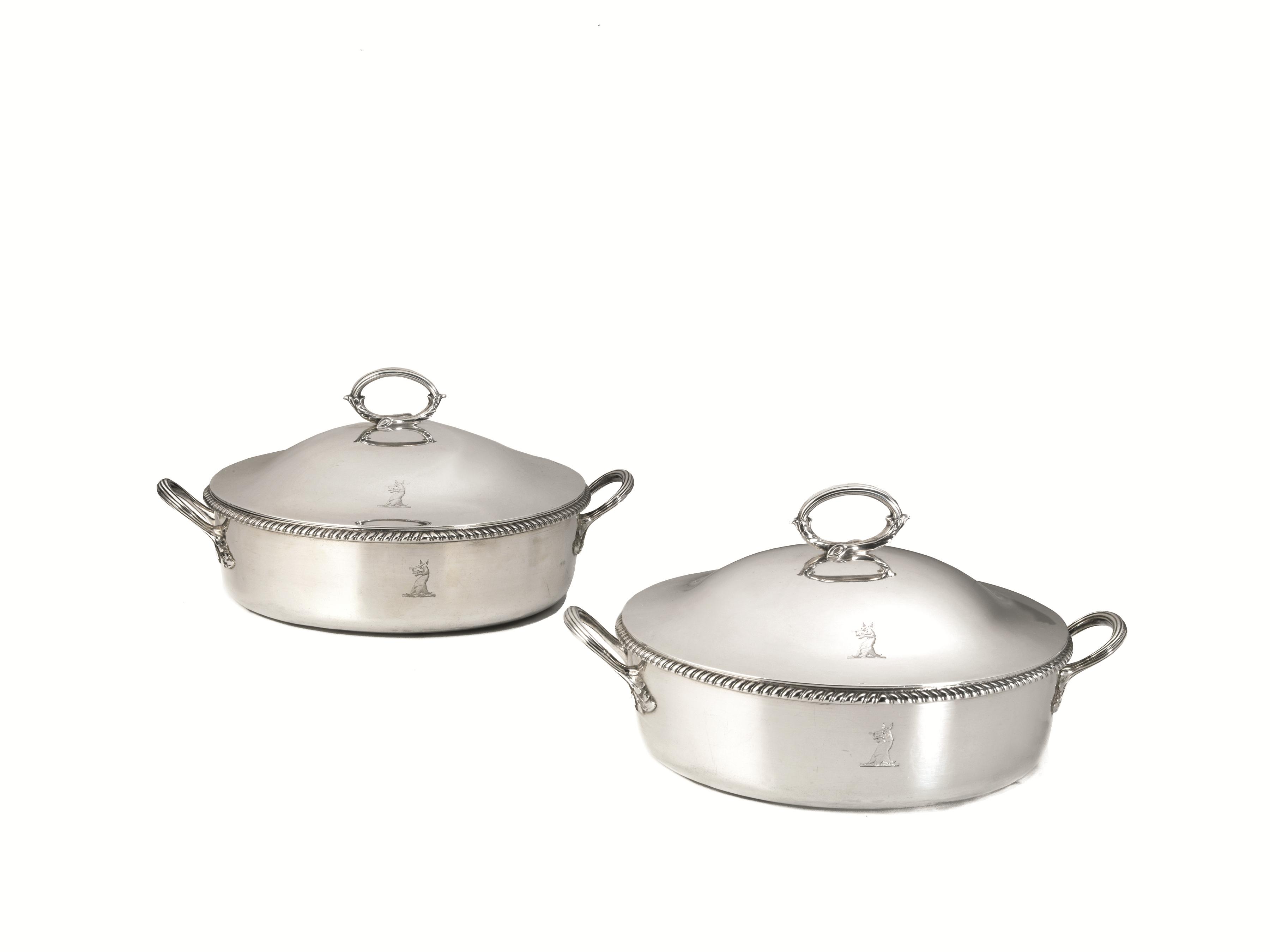 di forma circolare, corpo decorato da stemma inciso, profilo baccellato, due anse realizzate come tralci di foglie, presa del coperchio a racemo vegetale, diam. cm 22 g 2300 (2)