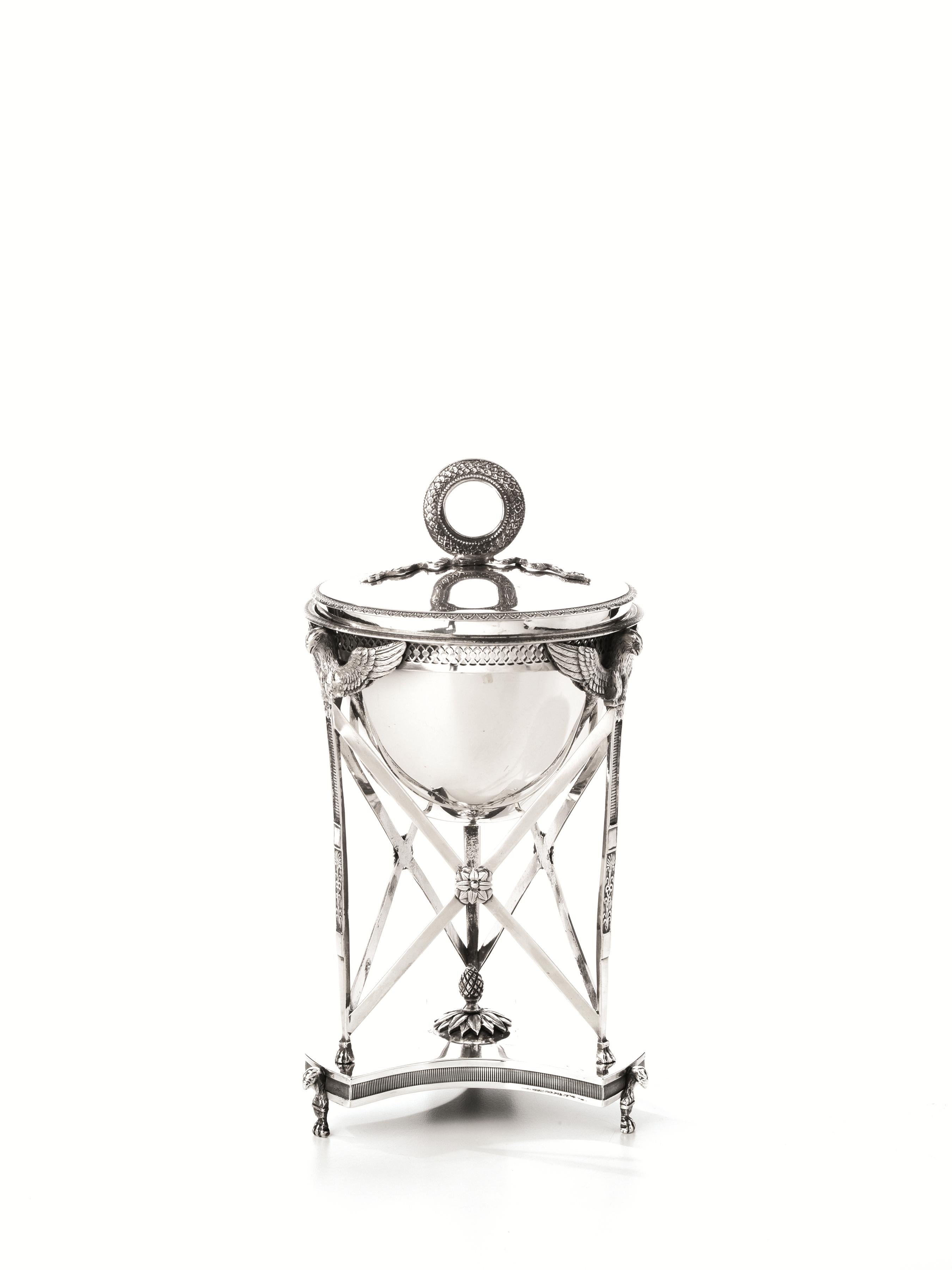 in argento, corpo semisferico poggiante su alto sostegno tripode con lesene terminanti a zampa ferina e con capitelli modellati ad aquila, base triangolare con tre piedini in foggia di grifi, presa del coperchio a ghirlanda circolare con nastro, alt. cm 24,5, g 750