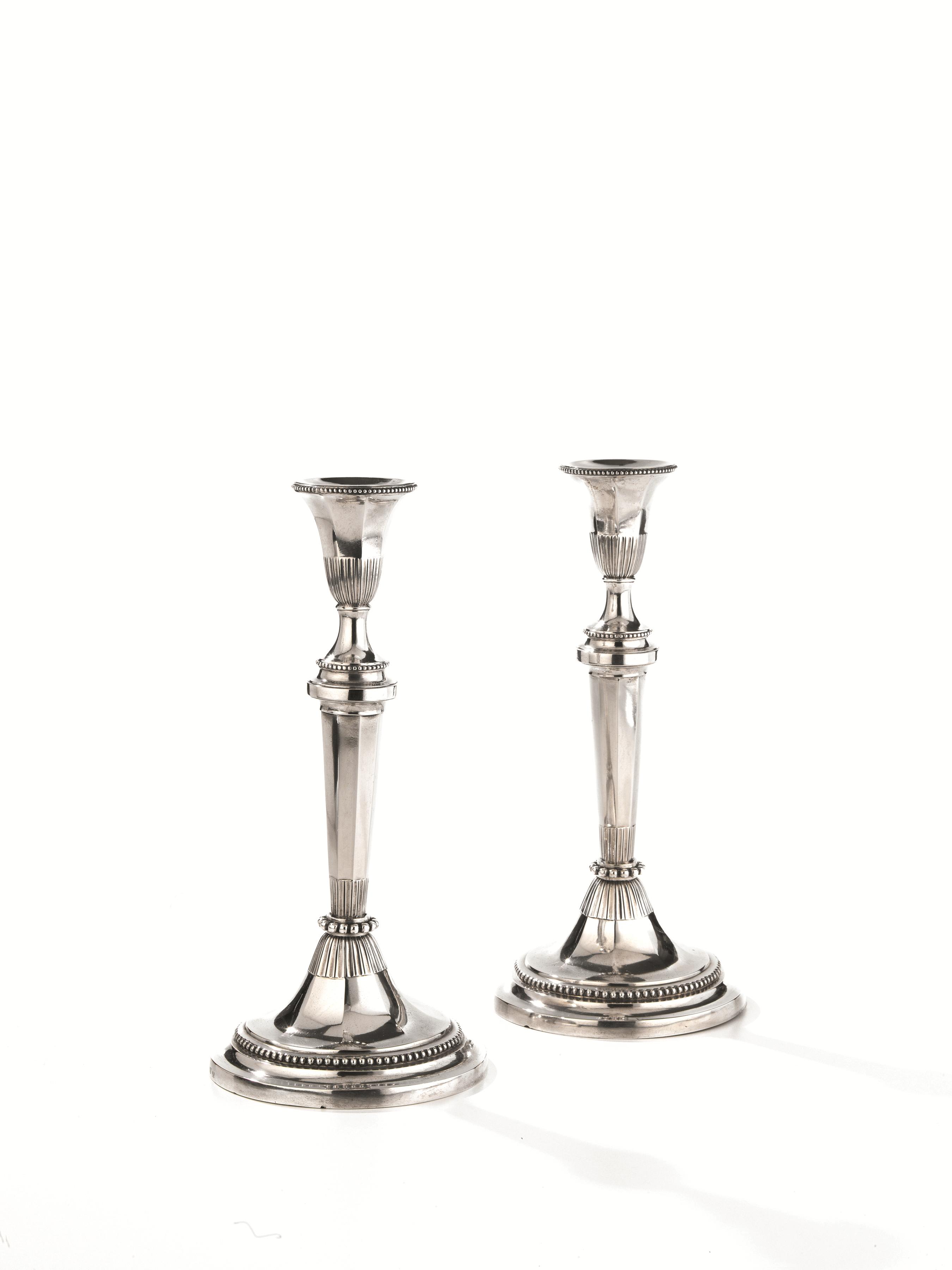 COPPIA DI CANDELIERI, PARMA, FINE SECOLO XVIII, ARGENTIERE ALESSANDRO BONANI