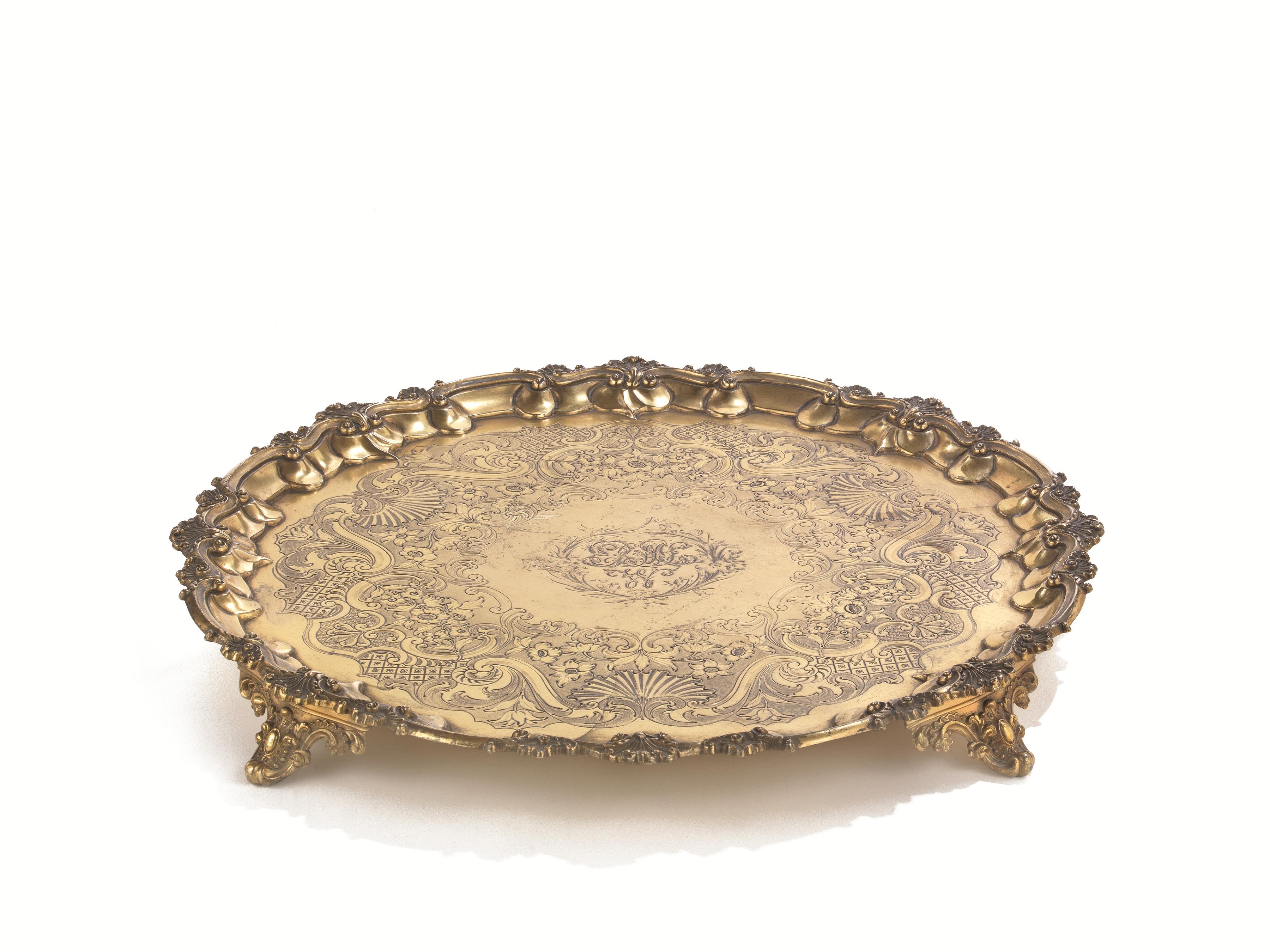 in vermeil, di forma circolare sagomata con tesa decorata a volute e conchiglie, piano riccamente inciso, al centro monogramma inciso, diam. cm 39, g 1645
