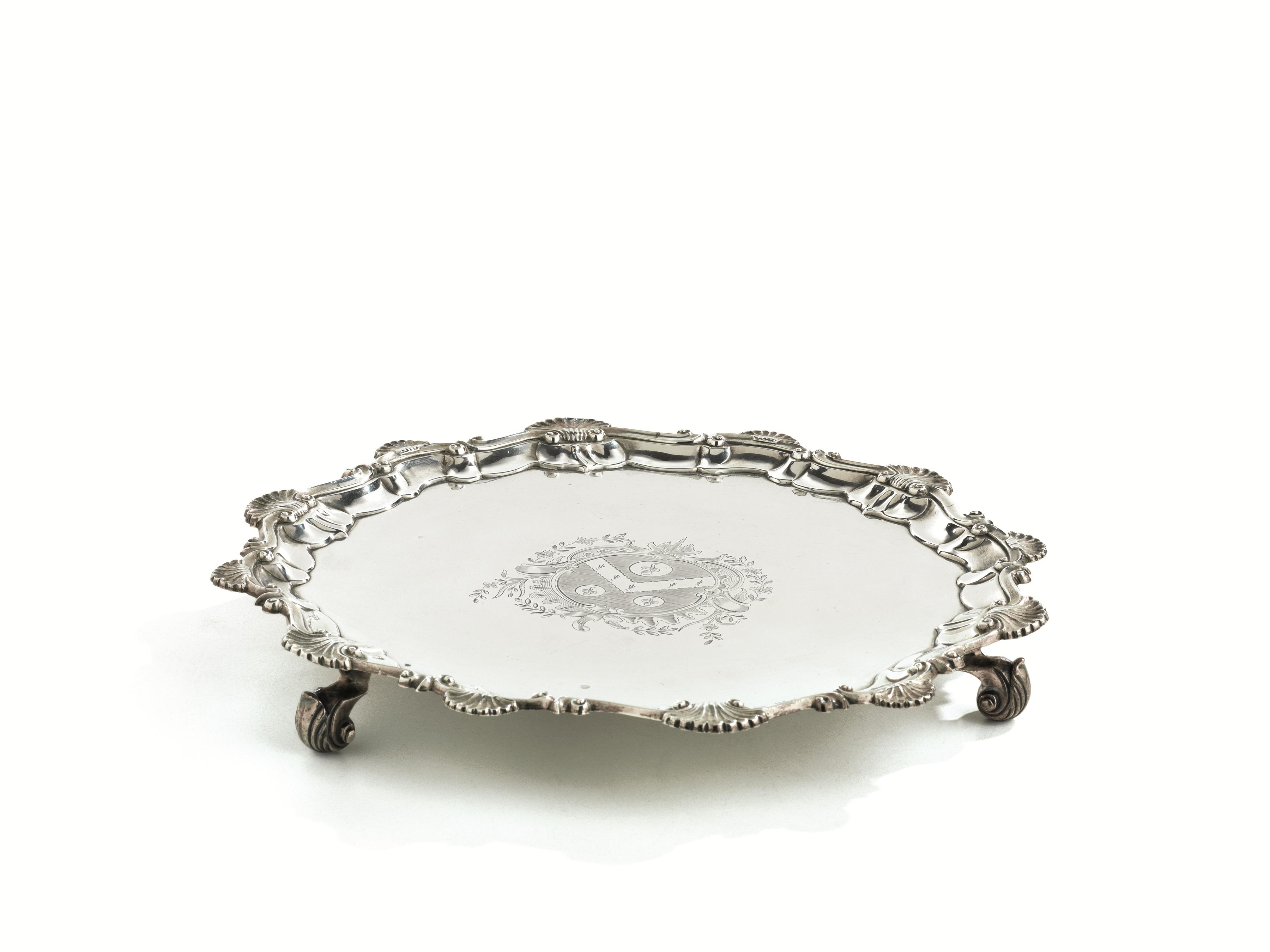 SALVER, LONDRA, 1762, ARGENTIERE ED. COPPER di roma circolare con tesa...