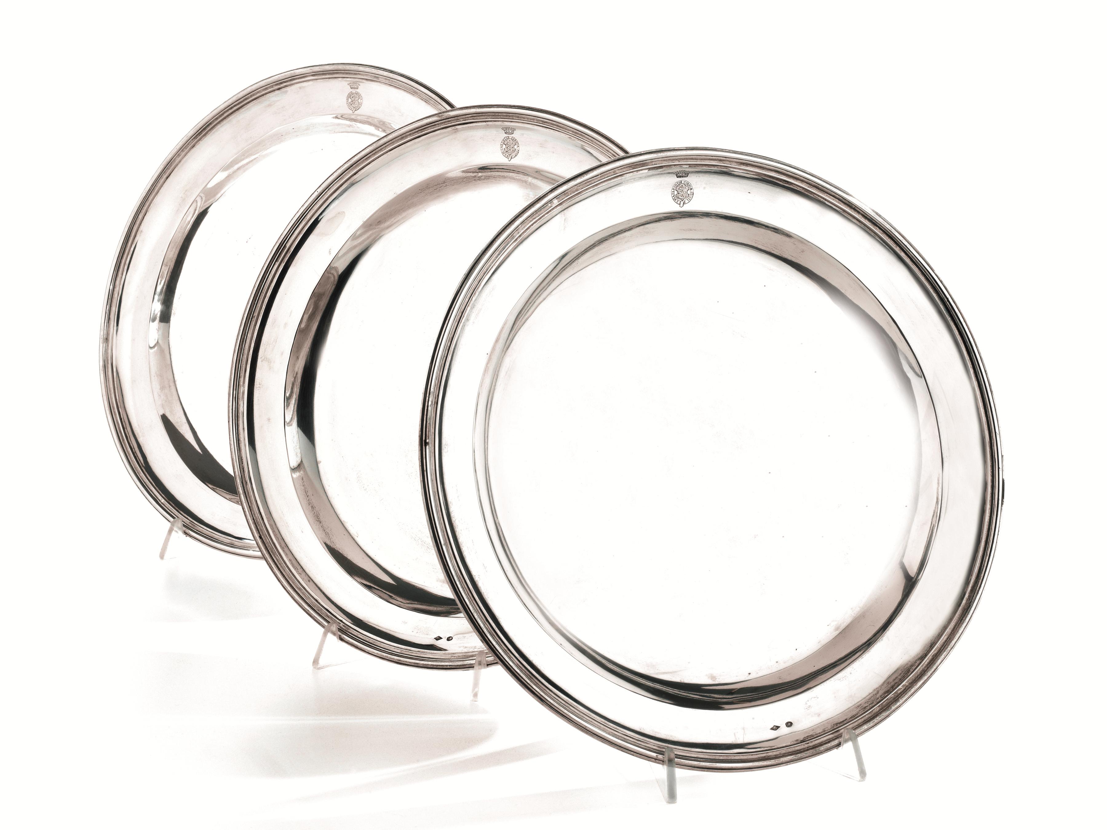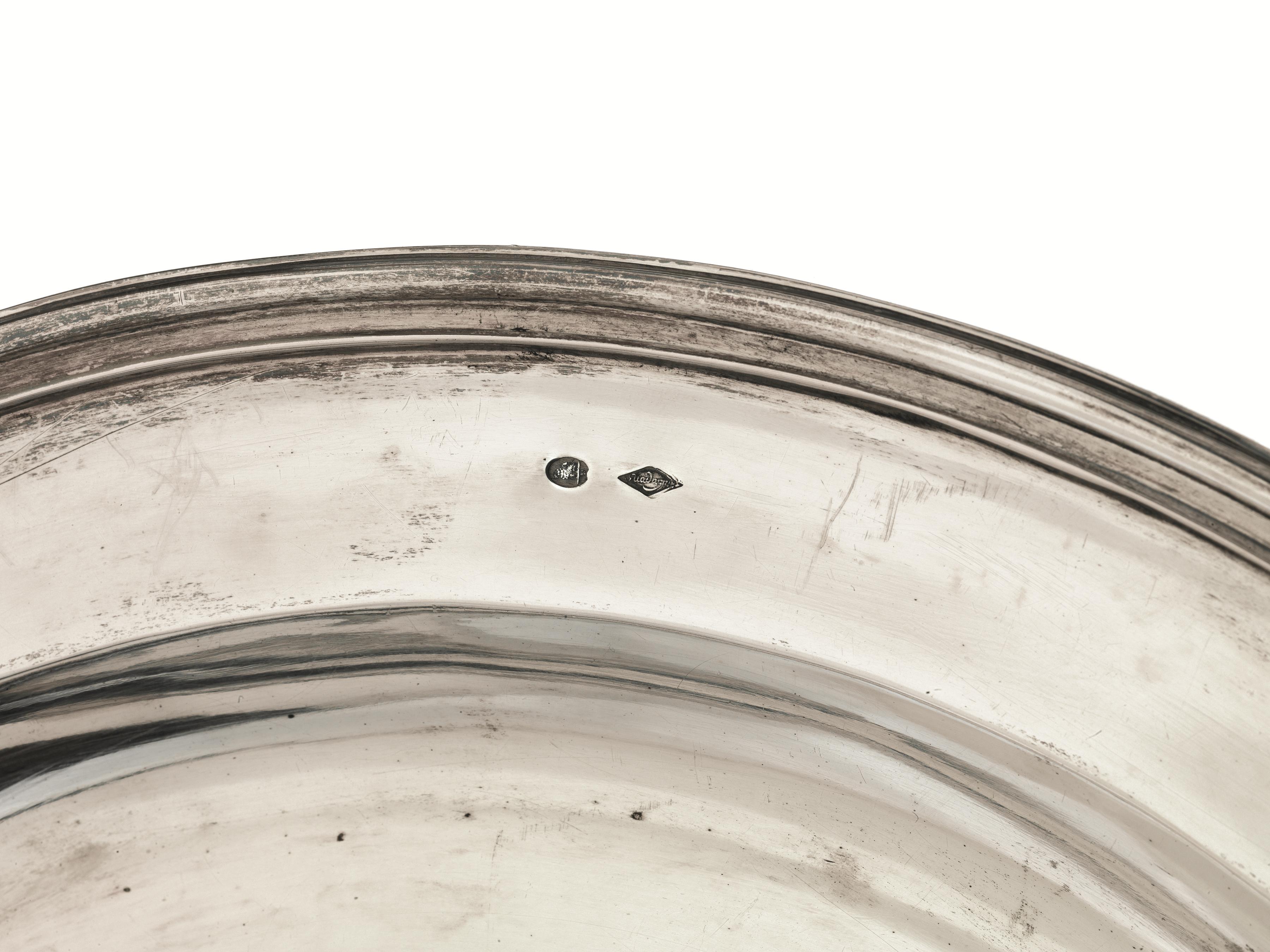in argento di forma circolare, tesa decorata da stemma nobiliare inciso ed iscrizione EXALTABUTUR CORNUA IUSTI, diam. cm 32, complessivi g 3620 (3)