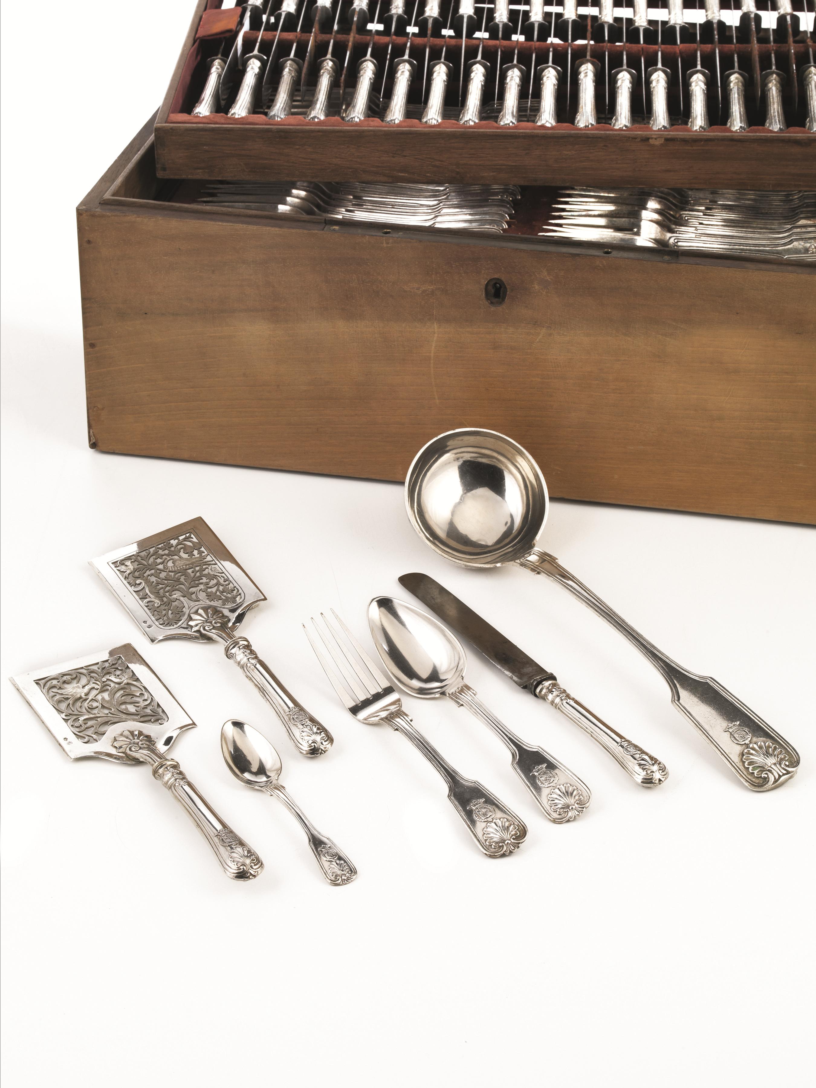 manici decorati da palmetta esplosa e stemma nobiliare coronato, composto di centoventisei pezzi, complessivi g 7870 circa, entro scatola