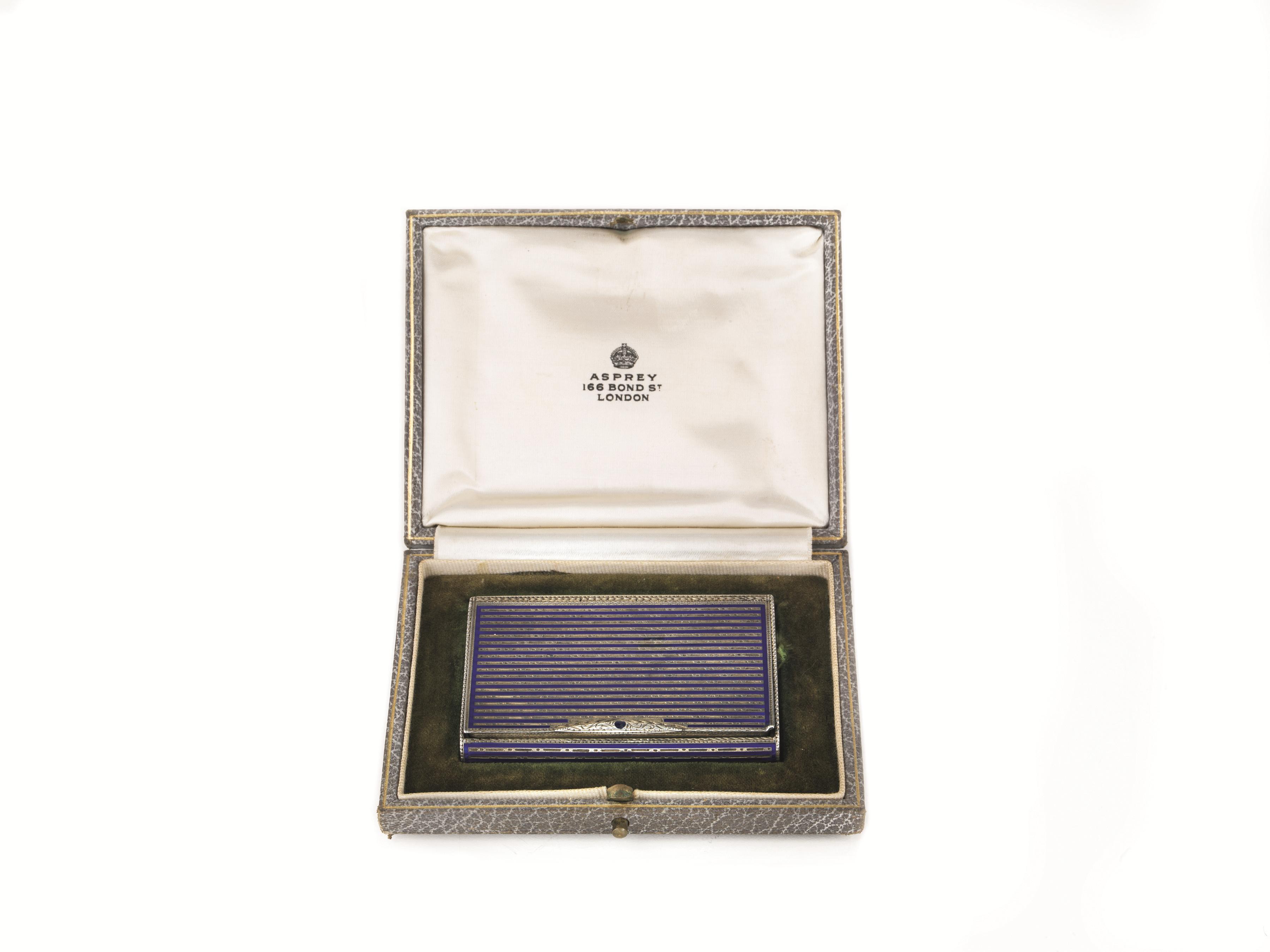 in argento e smalti di forma rettangolare, con angoli arrotondati, superficie incisa e decorata in smalto blu ad effetto rigato, cm 5x8, entro scatola Asprey London, lievi danni allo smalto
