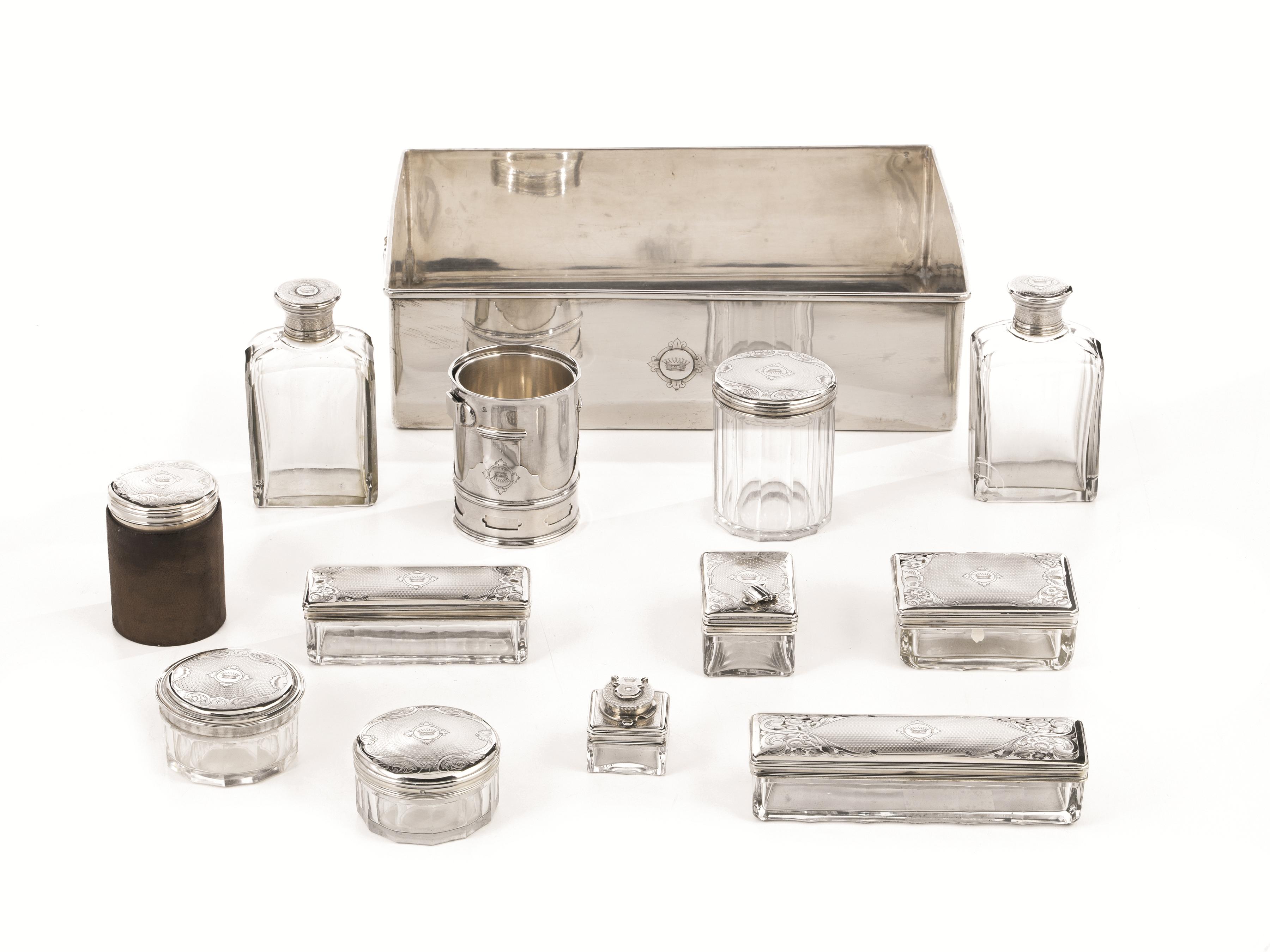 composto di cinque scatoline, due boccette, un flacone, una boccetta per inchiostro, una scatolina, un bicchiere ed un portapolvere in cristallo con coperchi in argento, entro cofanetto privo di coperchio (13)